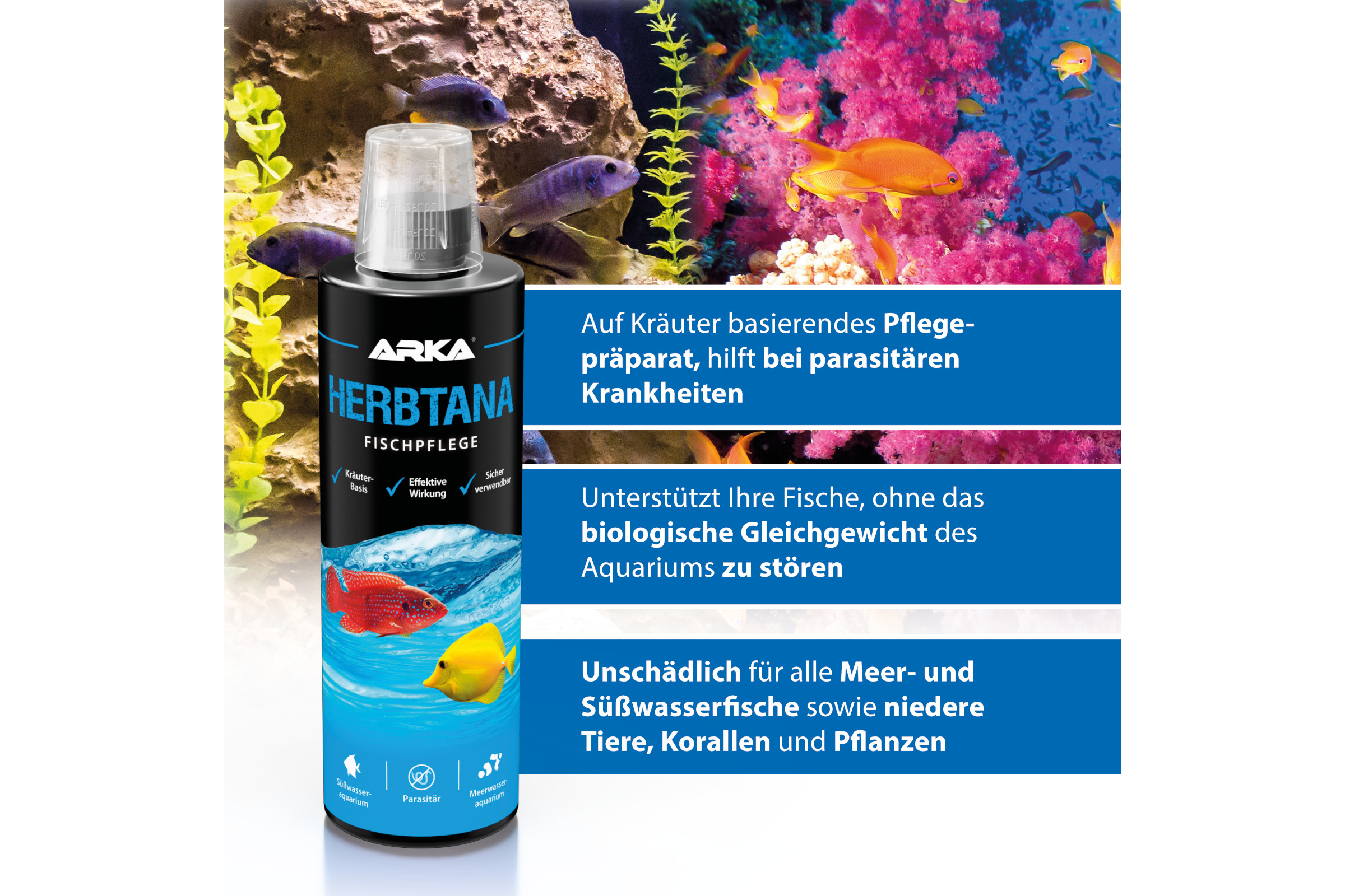 ARKA Herbtana ist ein rein biologisches Pflegemittel zur Unterstützung der natürlichen Immunabwehr bei Aquarienfischen. Das Produkt wird in Europa unter neuem Namen weitergeführt und basiert auf der bewährten Formulierung von Microbe-Lift Herbtana. Es richtet sich gezielt gegen äußere Belastungen durch parasitäre Organismen wie Ichthyophthirius (Weiße-Pünktchen-Krankheit), Oodinium (Samtkrankheit), Costia, Chilodonella, Trichodina sowie Haut- und Kiemenwürmer – ganz ohne den Einsatz chemischer Zusätze. Die pflanzliche Rezeptur wirkt dabei schonend und ist sicher für Korallen, Wirbellose, empfindliche Fische und Aquarienpflanzen. Herbtana kann sowohl in Süß- als auch in Meerwasseraquarien verwendet werden und empfiehlt sich besonders bei Neueinsetzungen, nach Transporten oder bei ersten Anzeichen äußerer Belastung.