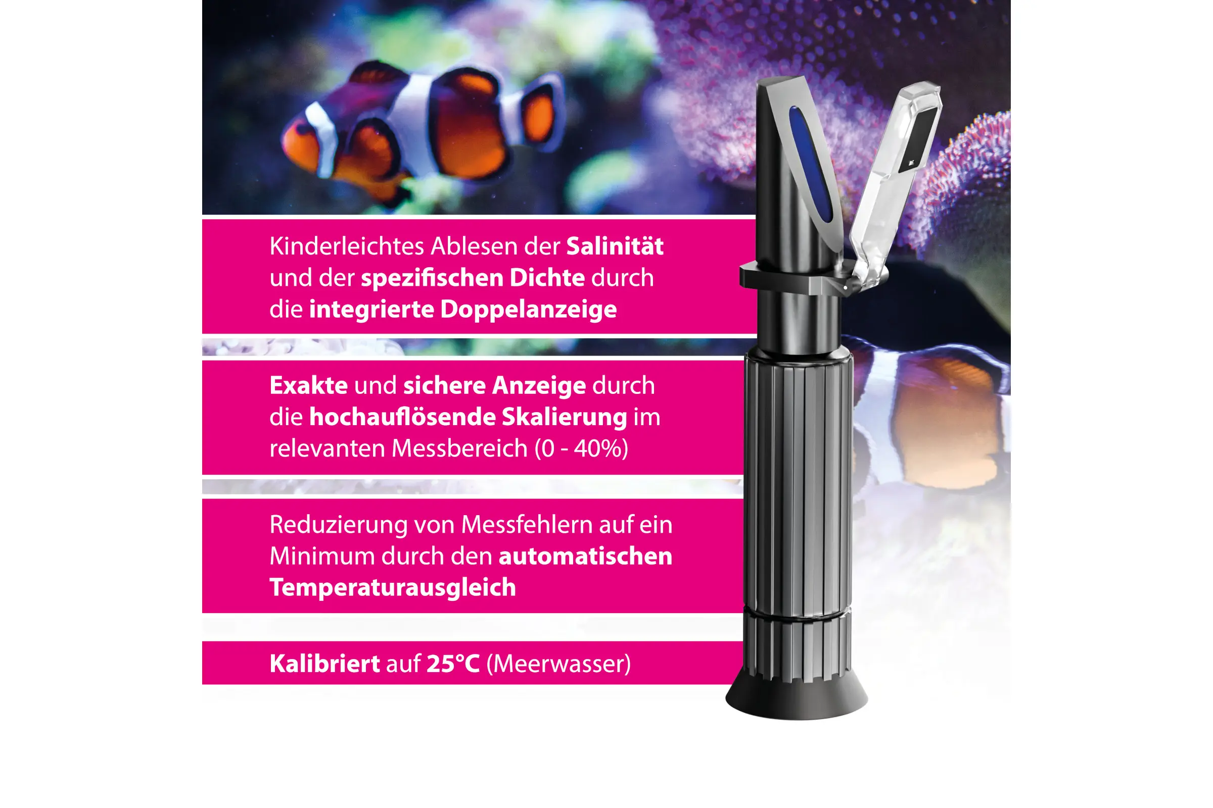 Das ARKA Refraktometer mit LED-Beleuchtung ist ein zuverlässiges Messinstrument für die regelmäßige Kontrolle der Salzkonzentration in Meerwasseraquarien – exakt, robust und leicht kalibrierbar.