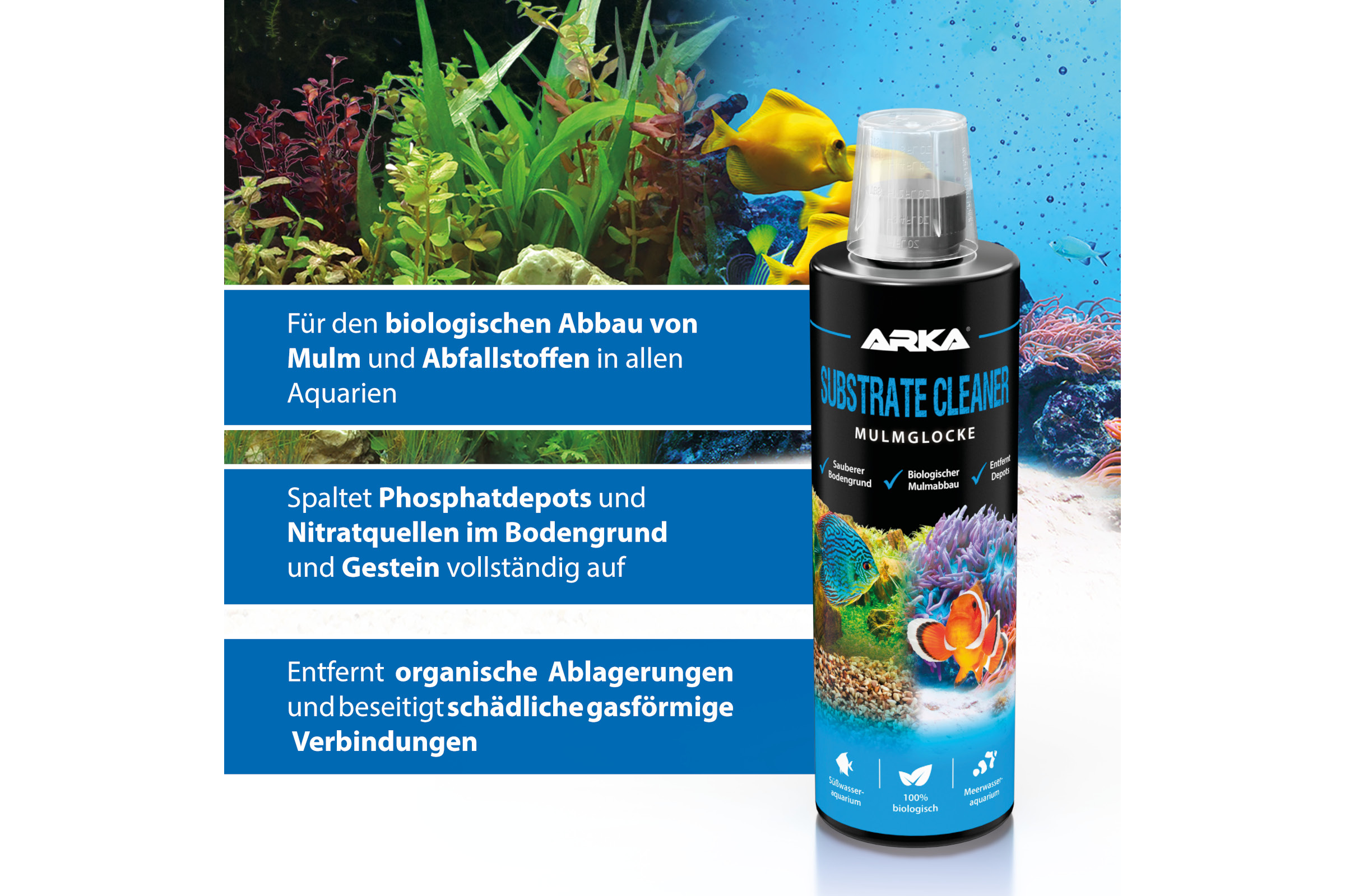 ARKA Substrate Cleaner wird gerne als „flüssige Mulmglocke“ bezeichnet – eine bildhafte Beschreibung für seine Funktion: Anstatt Mulm mit einem Schlauch abzusaugen, wie es mit einer echten Mulmglocke geschieht, zersetzt dieses Präparat organische Ablagerungen im Bodengrund mithilfe aktiver Sporenbakterien. Diese besiedeln gezielt sauerstoffarme Zonen im Substrat und beschleunigen dort den Abbau von Futterresten, Pflanzenmaterial und biologischem Schlamm. Das führt zu klarerem Wasser, stabileren Nährstoffverhältnissen und langfristig gesünderen Bedingungen im Aquarium. Die Rezeptur entspricht dem bekannten Microbe-Lift-Produkt und wird nun unter dem Markennamen ARKA fortgeführt.