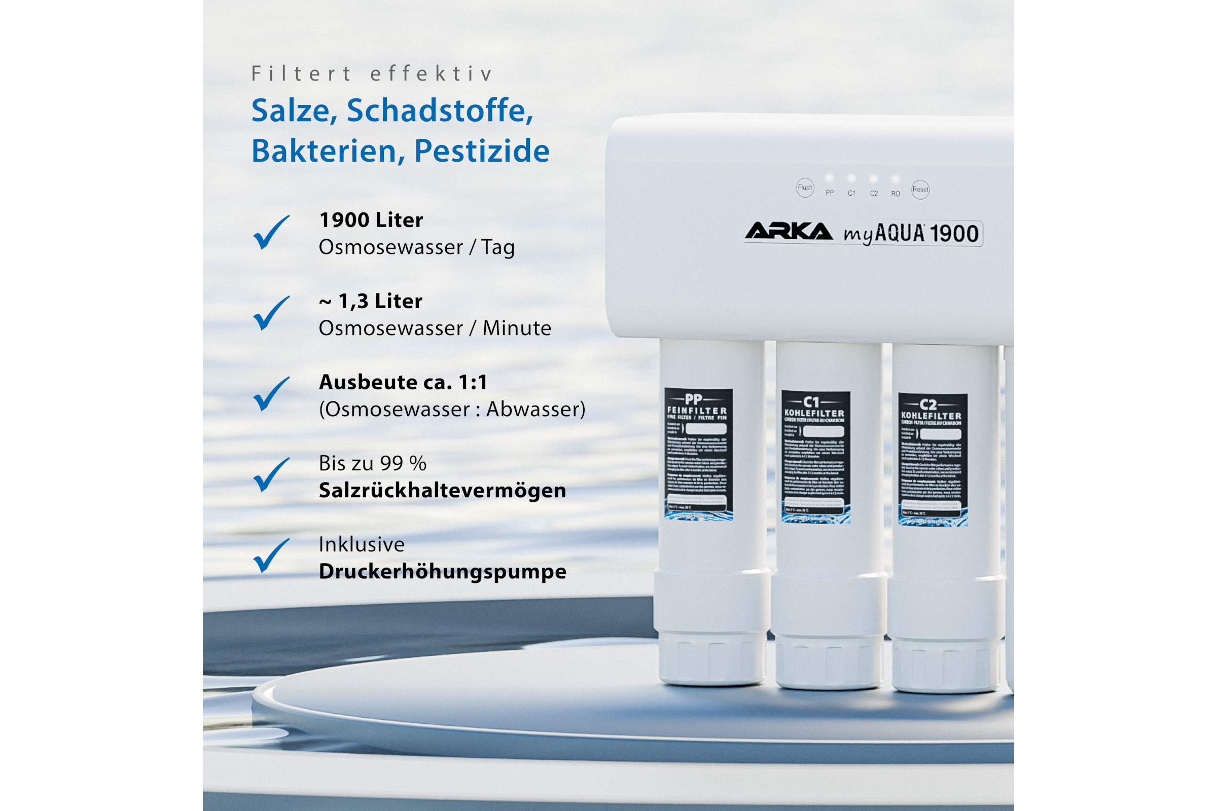 - Filtert bis zu 99 % aller gelösten Schadstoffe, Salze und Keime