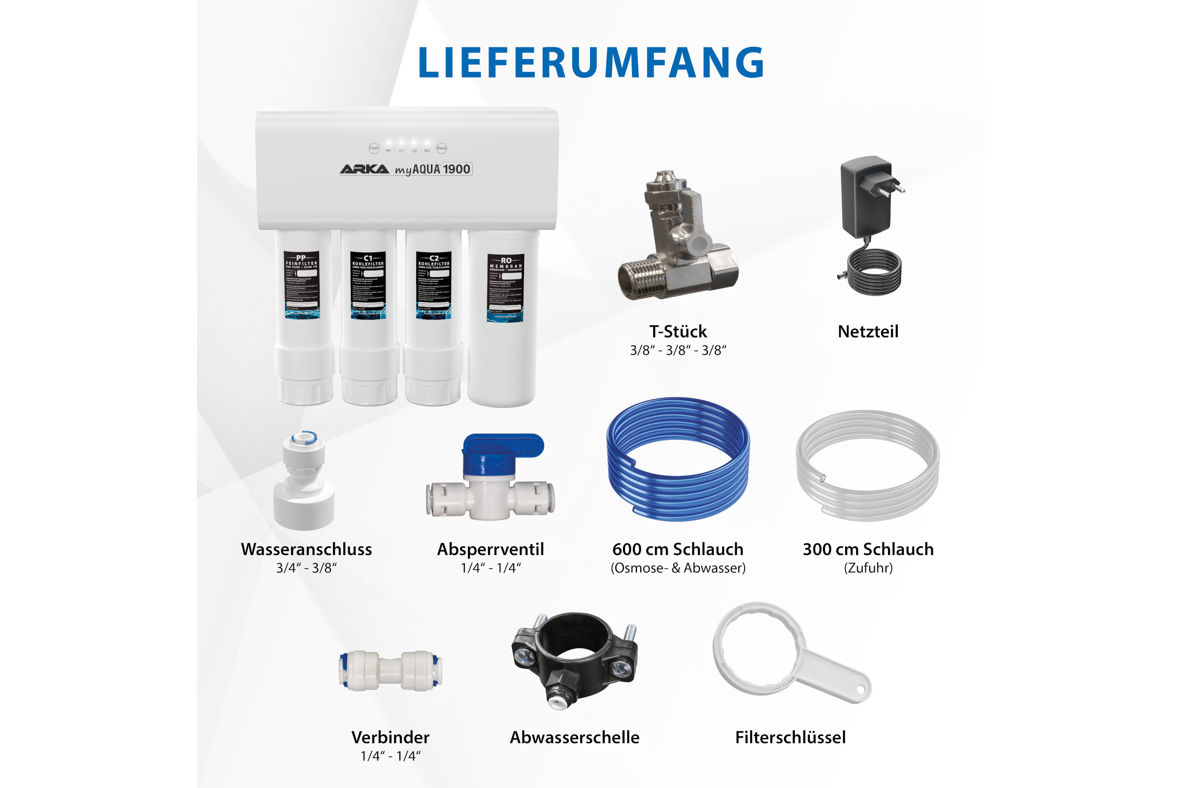 1 × ARKA myAQUA 1900 inkl. Filtersystem, Netzteil, Anschluss-Zubehör, 2 × Schlauch, Filterwechsel-Schlüssel und Wandhalterung.