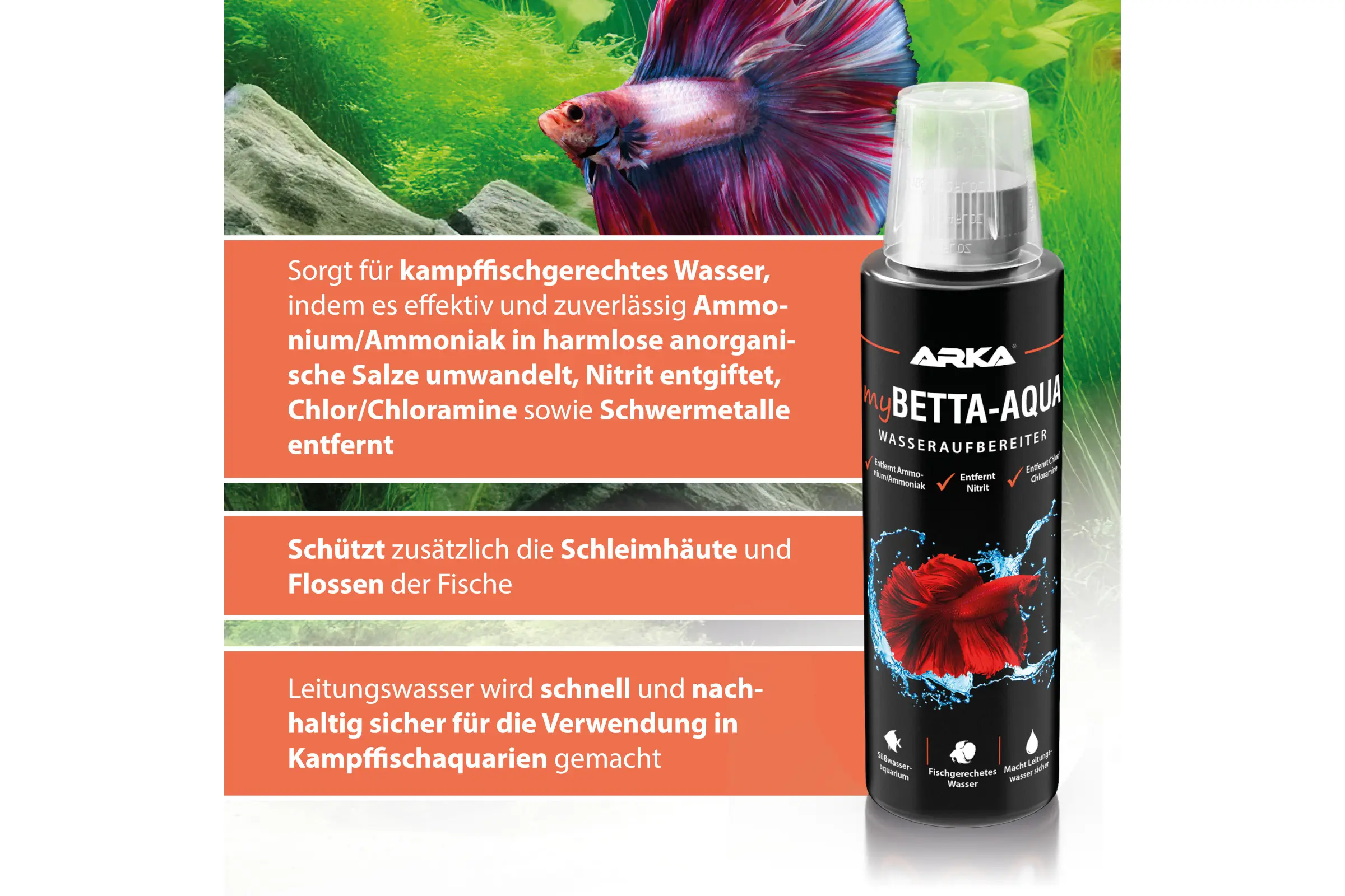 ARKA myBETTA‑AQUA ist die ideale Wasseraufbereitungslösung für Kampffische – schützt, stabilisiert und schafft perfekte Startbedingungen für ein gesundes Betta-Aquarium.