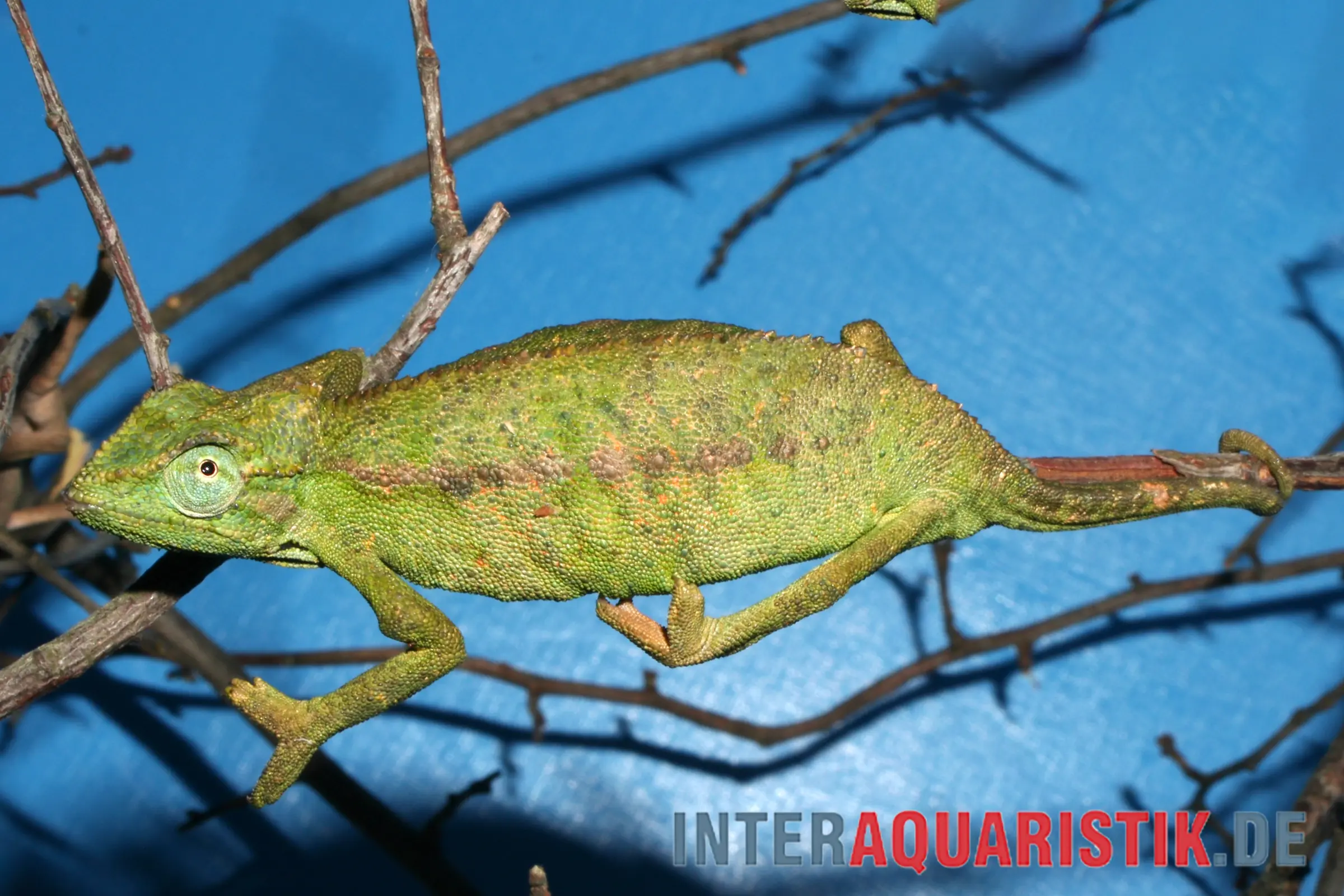 Adulte Exemplare des Blauen Chamäleons erreichen eine Größe von 15 bis 20 cm, wobei Männchen oft etwas schlanker und weibliche Tiere kräftiger gebaut sind. Diese kompakte Größe macht sie zu einer beliebten Art für kleinere, dennoch strukturreiche Terrarien.