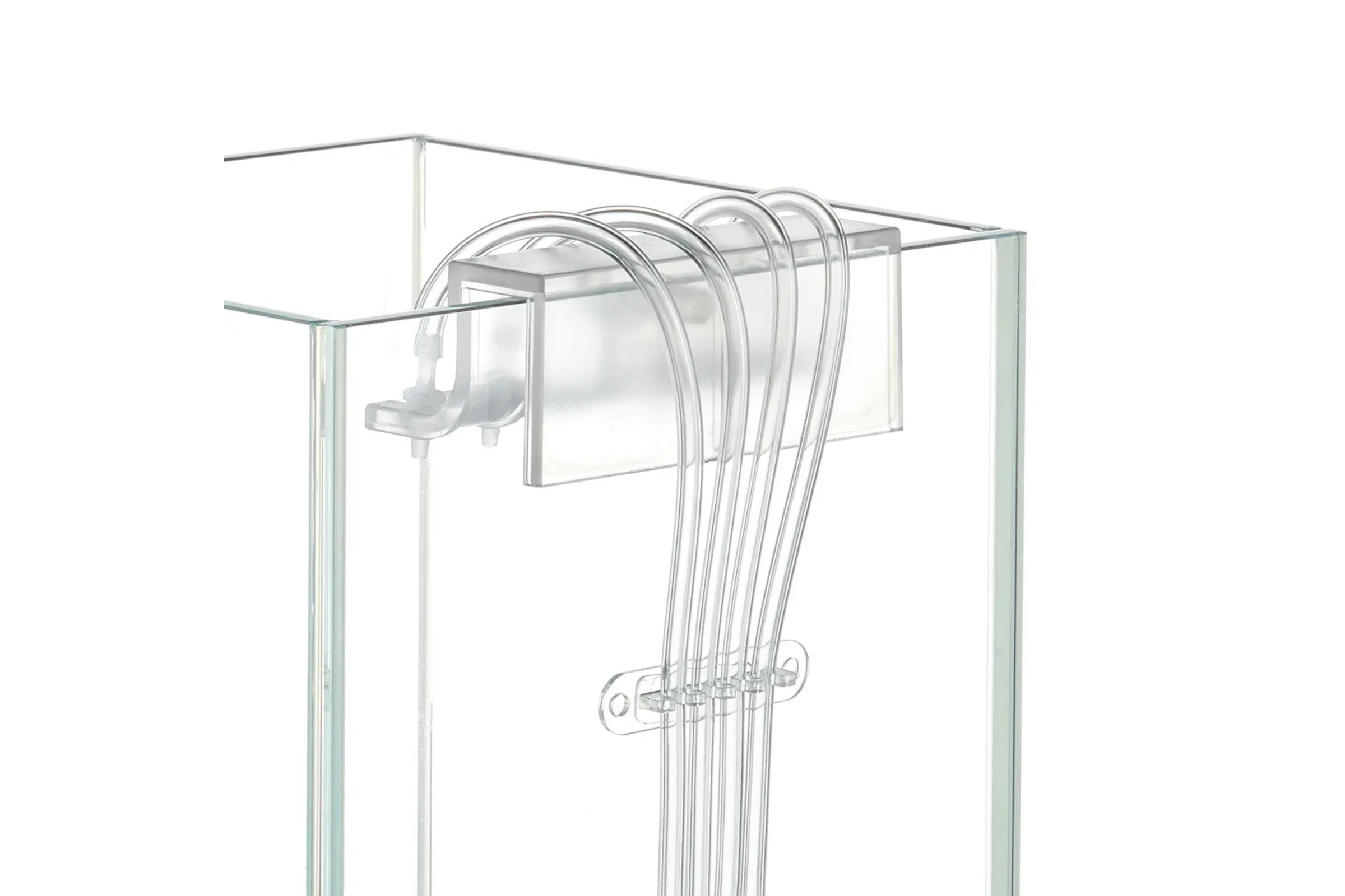 Der transparente Schlauch lässt sich auf jede gewünschte Länge zuschneiden und mit gängigen Dosierpumpen verbinden. Die Premium-Halterung bietet verschiedene Montagemöglichkeiten: Das Hauptmodul kann am Beckenrand befestigt oder mit den beiliegenden Klebepads auf Glas oder Kunststoffflächen fixiert werden. Drei zusätzliche Halteleisten mit Einzelclips ermöglichen eine gezielte Schlauchführung vom Technikbereich bis ins Aquarium – ideal für saubere Verlegung in Unterschränken oder entlang der Rückwand. Alle Bauteile sind aus langlebigem Kunststoff gefertigt und für den dauerhaften Einsatz im Feuchtbereich geeignet.Technische Übersicht