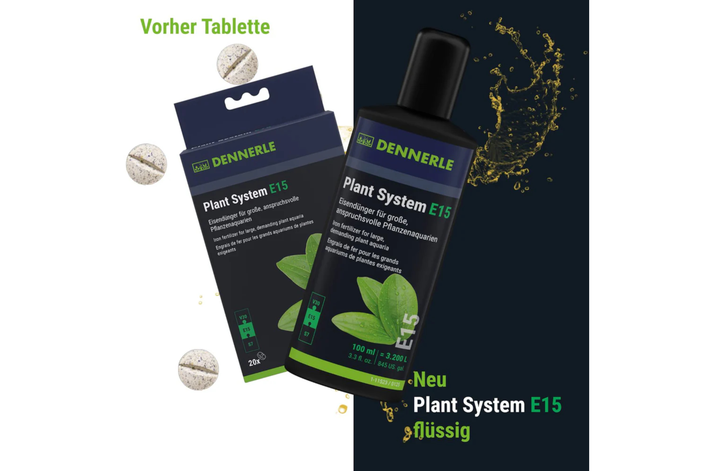 Das Dennerle New Plant System E15 ist ein flüssiger Eisendünger für anspruchsvolle Aquarienpflanzen im Süßwasseraquarium und ersetzt die frühere E15-Tablette. Durch die flüssige Form stehen Eisen und wichtige Spurenelemente den Pflanzen deutlich schneller und gleichmäßiger zur Verfügung, da sie direkt über das Aquarienwasser aufgenommen werden können. Dies erleichtert die Dosierung, verbessert die Verteilung im Becken und ermöglicht eine präzisere Anpassung an den tatsächlichen Pflanzenbedarf.
