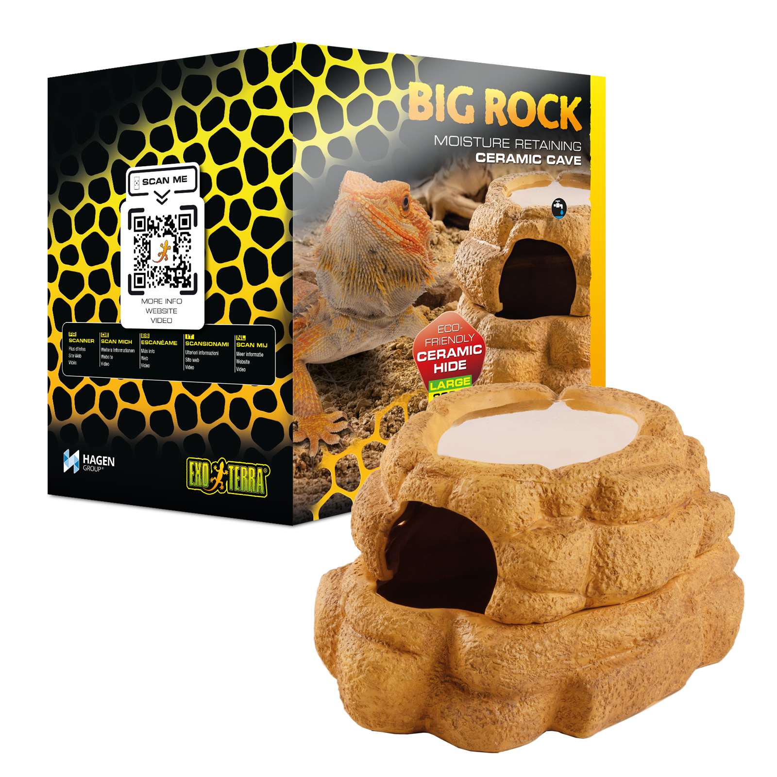Big Rock Large bietet Ihren Reptilien, Amphibien und Wirbellosen ein sicheres und feuchtes Versteck im Terrarium. Diese Höhle aus hochwertiger Keramik schafft ein ideales Mikroklima, das die natürliche Feuchtigkeit reguliert und so zur Gesundheit und zum Wohlbefinden Ihrer Tiere beiträgt. Durch das natürliche Aussehen fügt sich das Versteck harmonisch in jedes Terrarium ein und ersetzt künstlich wirkende Dekorationen. Die abnehmbare Abdeckung ermöglicht Ihnen einen leichten Zugang zum Inneren, etwa zur Beobachtung oder zur Entnahme von Eiern.