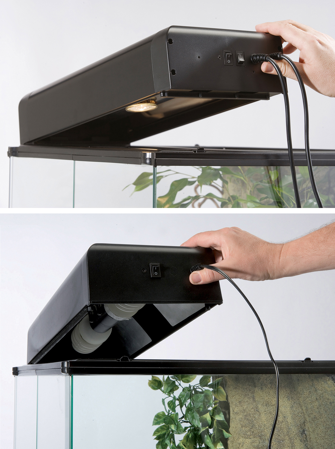 Setzen Sie einfach die Lampe Ihrer Wahl – beispielsweise eine Exo Terra Terrarienlampe oder Glühlampe mit E27-Fassung – in die Fassung ein und befestigen Sie die Abdeckung auf dem Terrarium. Nutzen Sie die Aussparung, um praktisches Zubehör wie einen Thermometer oder Hygrometer direkt zu integrieren. So erhalten Sie optimale Licht- und Klimabedingungen für Ihre Terrarientiere.