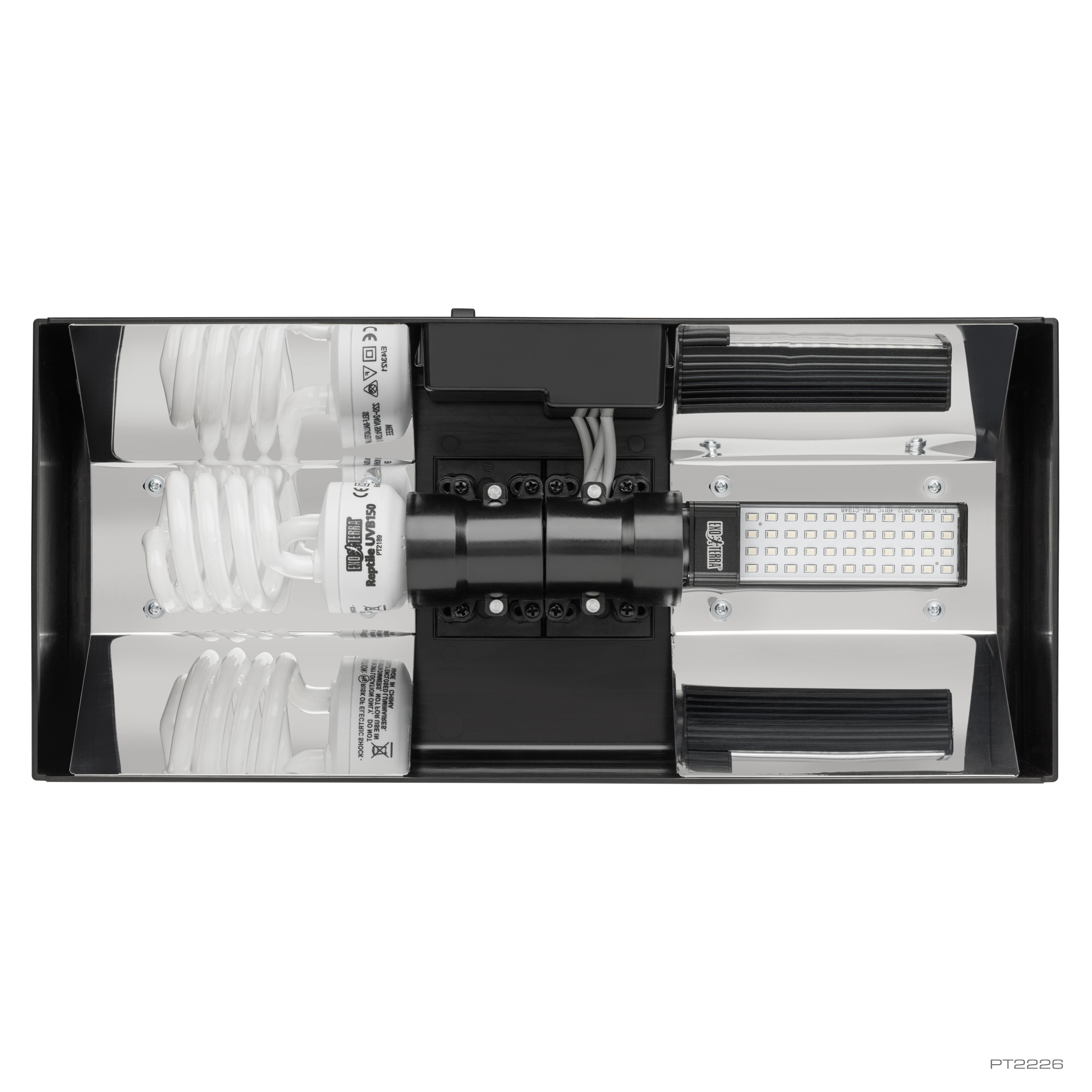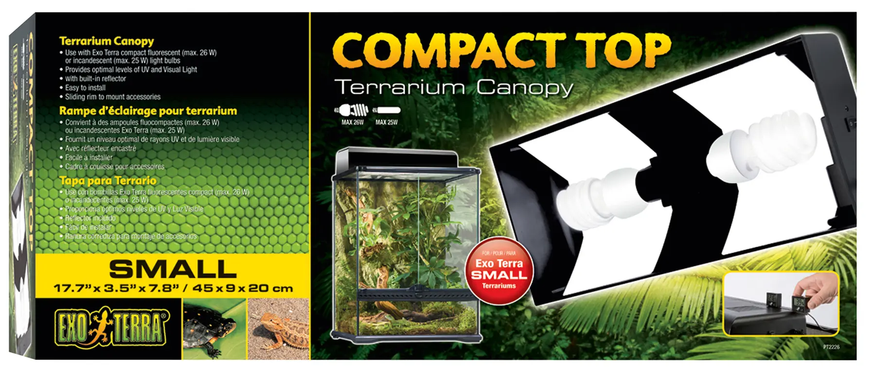 Exo Terra Compact Top bietet eine praktische und platzsparende Lösung, um Ihr Terrarium optimal zu beleuchten. Mit integriertem Reflektor und Platz für zwei Terrarienlampen bis zu 26 Watt pro Fassung sorgt diese Abdeckung für ideale Lichtverhältnisse und lässt sich besonders einfach installieren.