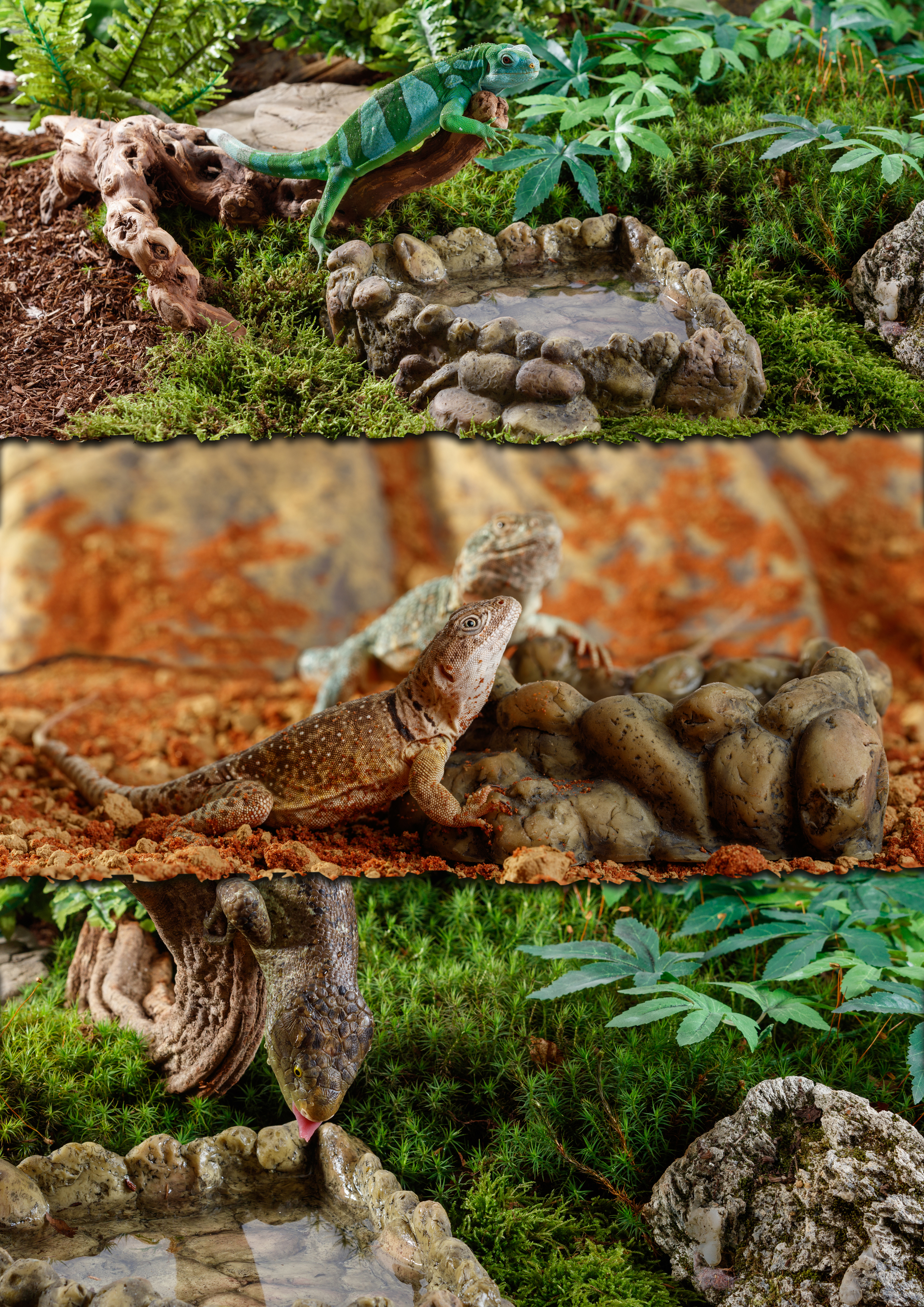 Steinartige Optik sorgt dafür, dass der Wassernapf optisch ins Terrarium integriert ist. - Platzsparende Eckform