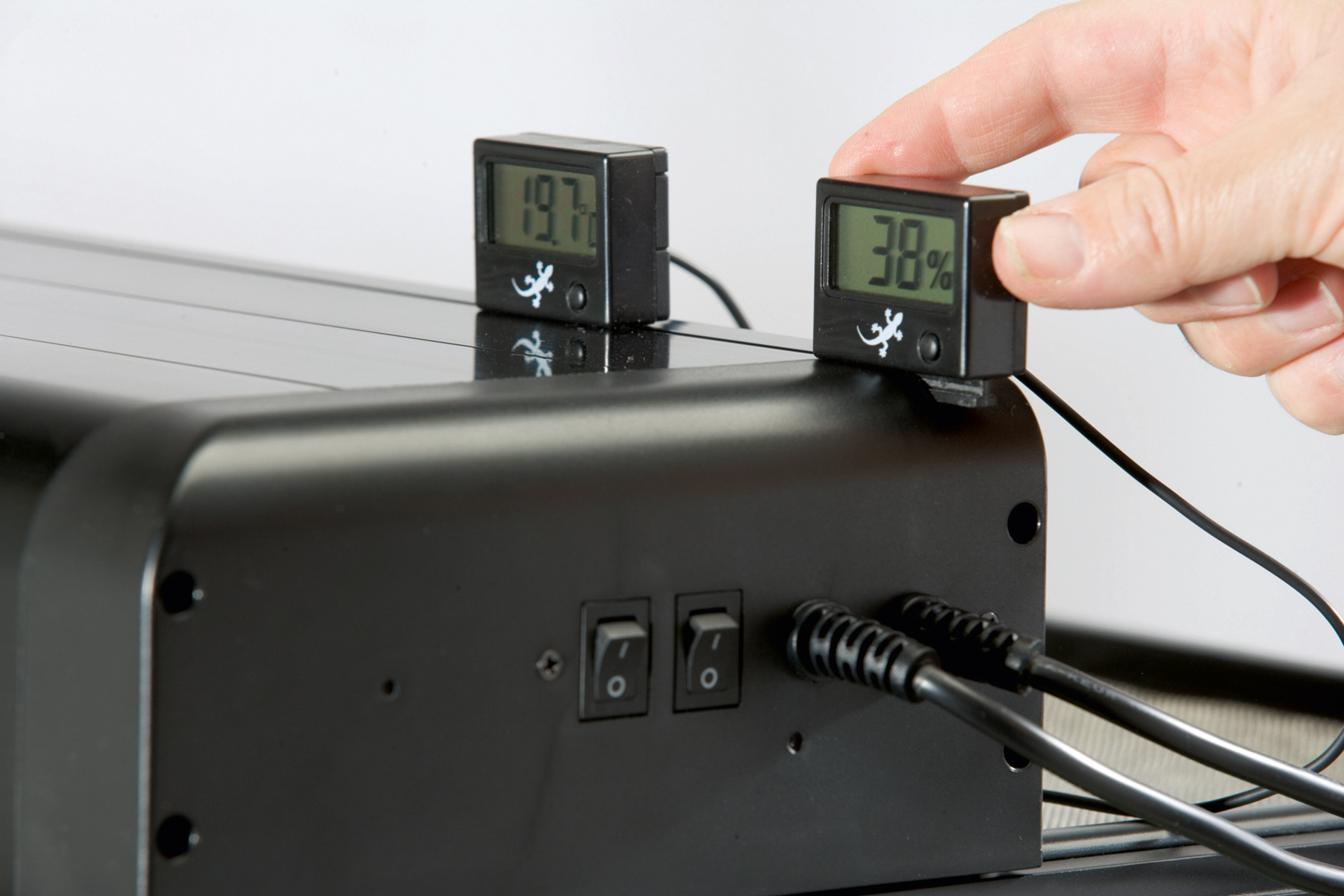 Das digitale Thermometer lässt sich schnell und unkompliziert im Terrarium platzieren. Der mitgelieferte Fernsensor kann mittels Saugnapf flexibel angebracht oder mit dem beiliegenden Klettverschluss befestigt werden. Besonders praktisch: Es kann direkt in die Aussparung Ihrer Exo Terra Compact Top oder Linear Fluorescent Top Lampen-Abdeckung eingeschoben werden. Die Bedienung erfolgt über nur eine Taste, mit der Sie spielend leicht Mindest- und Höchstwerte abfragen.