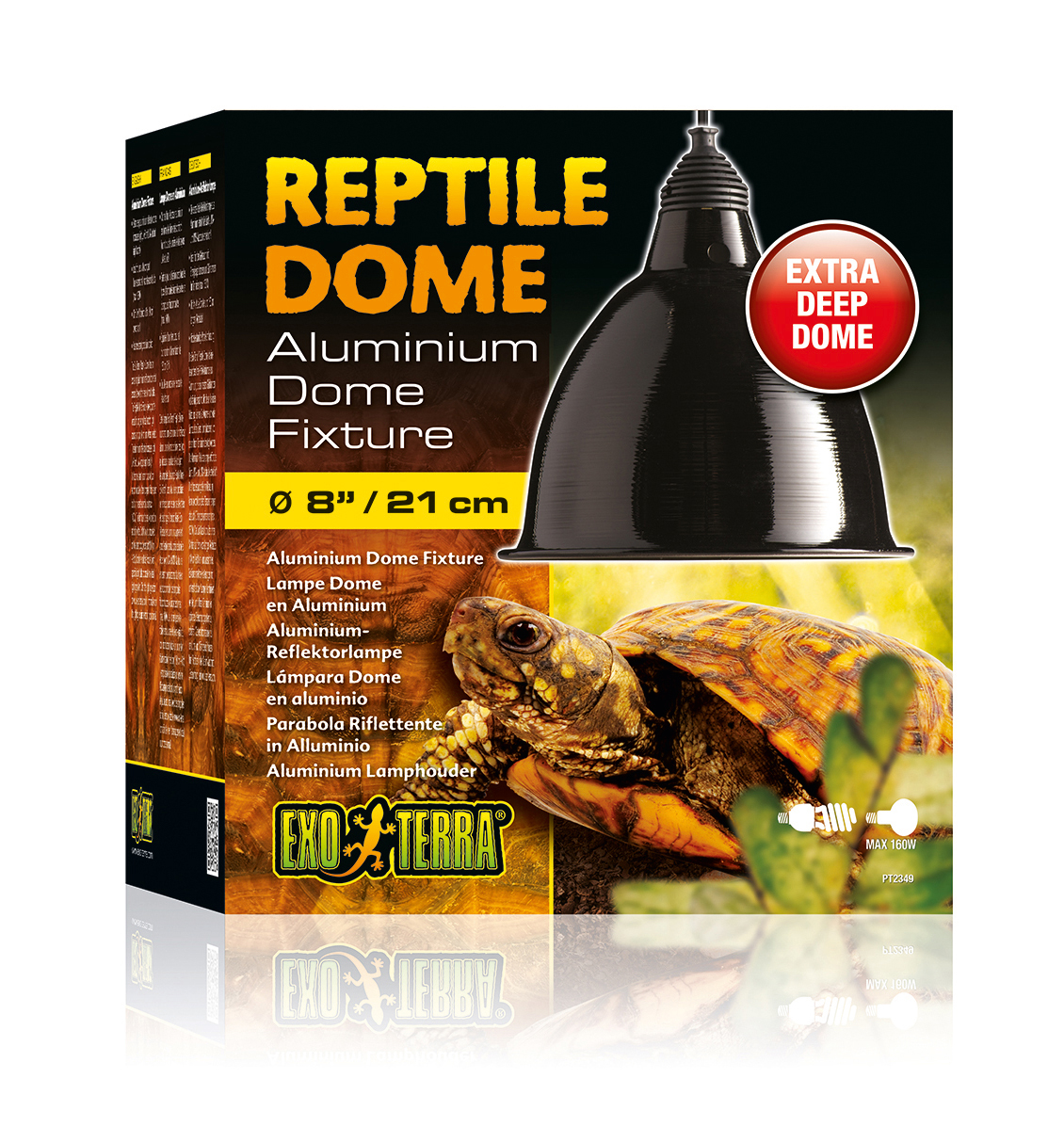 Aluminium-Reflektorlampe Die Exo Terra Reptile Dome ist eine besonders tiefe Reflektorlampe, die speziell entwickelt wurde, um die Licht-, UVA- und UVB-Ausbeute für Reptilien zu maximieren. Dank hitzebeständiger Porzellanfassung eignet sie sich für Lampen bis zu 160 Watt und ist damit ideal für Terrarien verschiedener Größen. Das extra-lange Netzkabel mit praktischem An- und Ausschalter sorgt für eine flexible und sichere Handhabung.