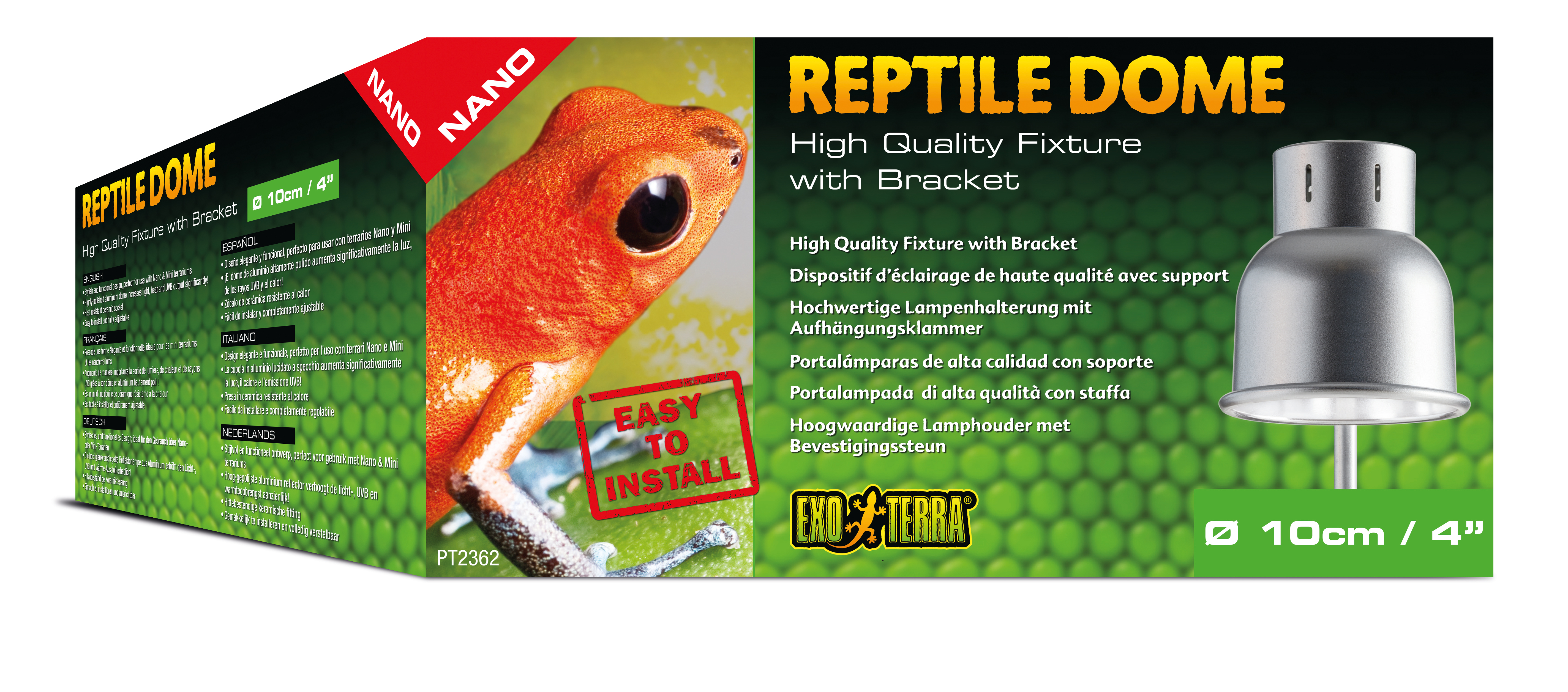 Reptile Dome Nano ist die ideale Lösung für die Beleuchtung und Beheizung von Nano- und Mini-Terrarien. Mit ihrem schicken, funktionalen Design aus hochwertigem Aluminium passt diese Lampenhalterung hervorragend zu jedem Terrarienstil und integriert sich unauffällig in Ihr Wohnambiente. Ein verspiegelter Reflektor sorgt für eine hohe Licht-, UVB- und Wärmewirkung. Die robuste Keramikfassung ist hitzebeständig und für Leuchtmittel bis 40 Watt geeignet.