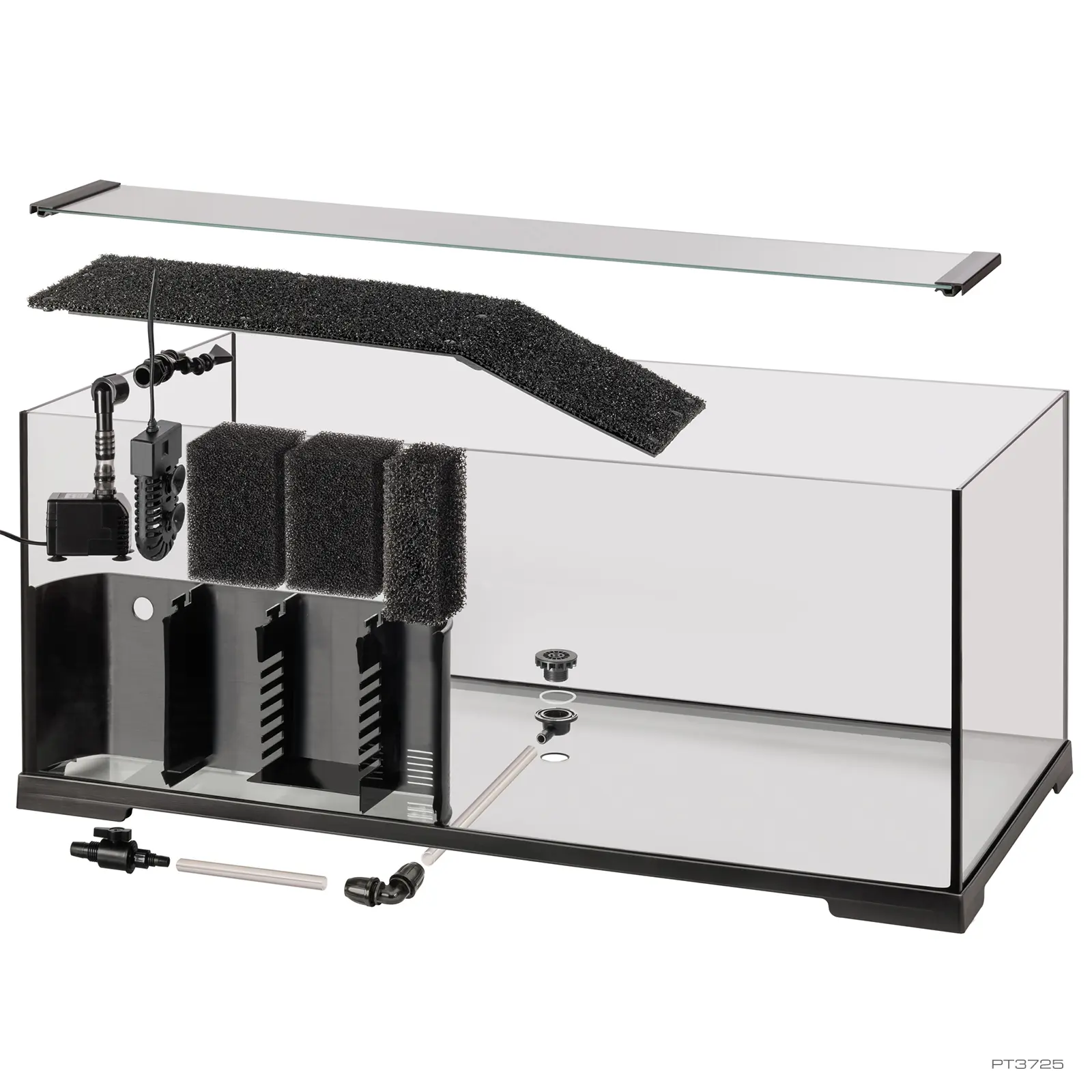 Exo Terra Turtle Haven bietet eine komfortable und sichere Behausung für Wasserschildkröten, Amphibien und Wirbellose. Das großzügige Glasterrarium mit integriertem Filtersystem und Landfläche sorgt für ein naturnahes und pflegeleichtes Zuhause Ihrer Tiere. Durch das offene Design haben Sie stets einen perfekten Blick ins Becken und können leicht Fütterung und Pflege vornehmen. Das praktische Bodenabflusssystem erleichtert Ihnen den Wasserwechsel und hält das Wasser sauber, damit Ihre Schildkröten beste Bedingungen genießen.