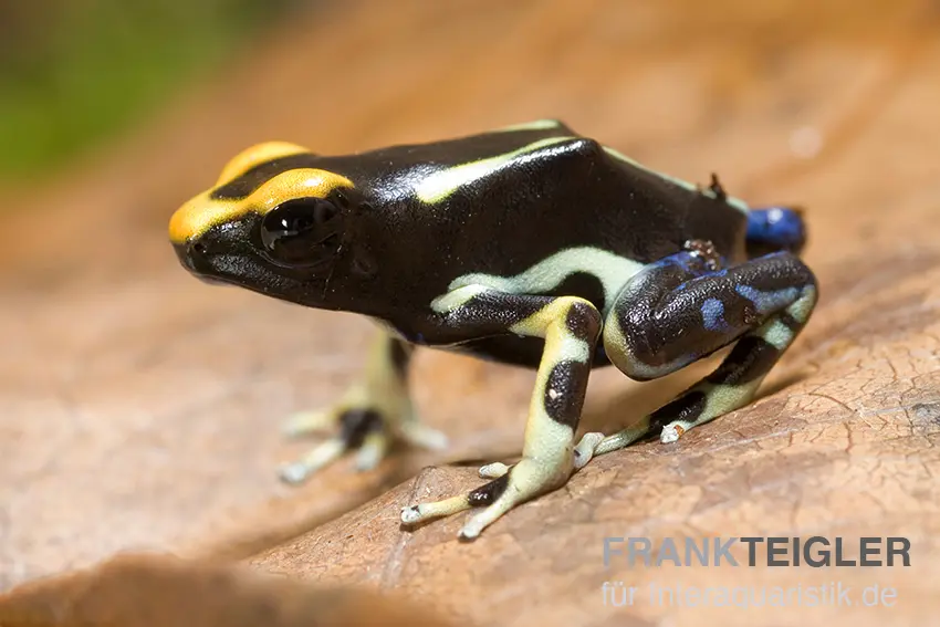 Der Färberfrosch "Alanis" stammt aus den tropischen Regenwäldern Surinams und Französisch-Guayanas. Seine auffällige schwarz-gelbe Zeichnung dient als effektives Warnsignal für Fressfeinde. Die Beine können einen bläulichen Schimmer aufweisen, was ihn optisch besonders attraktiv macht. Er ist tagaktiv und bevorzugt feuchte, bodennahe Verstecke, nutzt aber auch niedrig wachsende Pflanzen zur Erkundung seiner Umgebung.