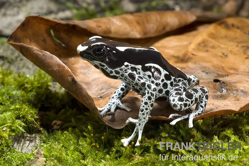 Die außergewöhnliche schwarz-weiße Zeichnung mit den charakteristischen grauen Beinen macht diesen Färberfrosch zu einem echten Hingucker. Sein Farbmuster variiert individuell und ist bei jedem Tier einzigartig.