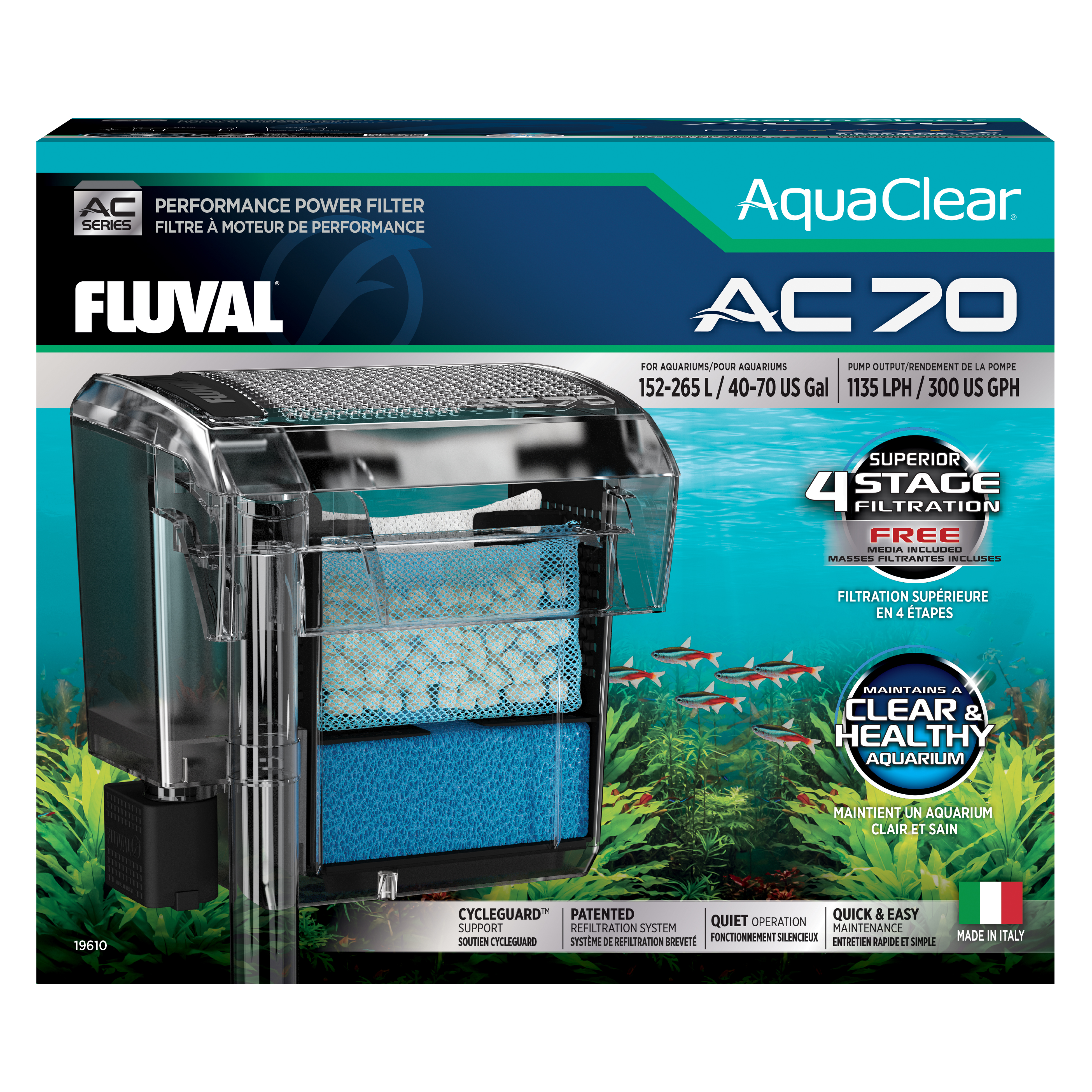 Mit dem Fluval AquaClear AC70 entscheiden Sie sich für einen leistungsstarken und wartungsfreundlichen Filter, der zuverlässig für klare Verhältnisse in Ihrem Aquarium sorgt. Besonders die vierstufige Filtertechnik und der Erhalt des biologischen Gleichgewichts machen dieses Modell zur idealen Wahl für anspruchsvolle Einsteiger und fortgeschrittene Aquarienliebhaber.