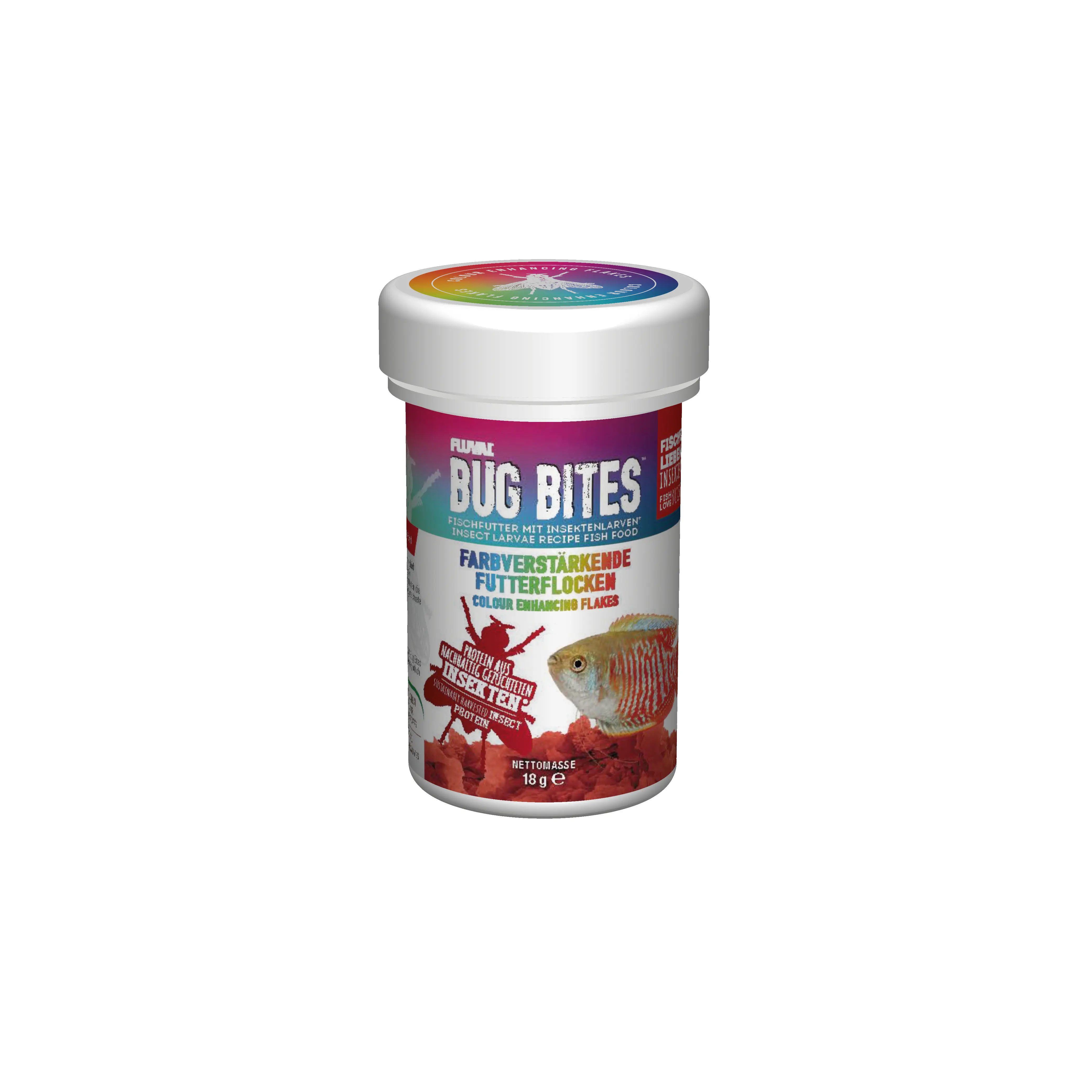 Bug Bites Colour Enhancing Flakes bieten Ihren Zierfischen eine ausgewogene, naturnahe Ernährung. Die Futterflocken wurden mit Insekten und Garnelenmehl angereichert und fördern auf natürliche Weise die Farbpracht sowie die Gesundheit Ihrer Fische.