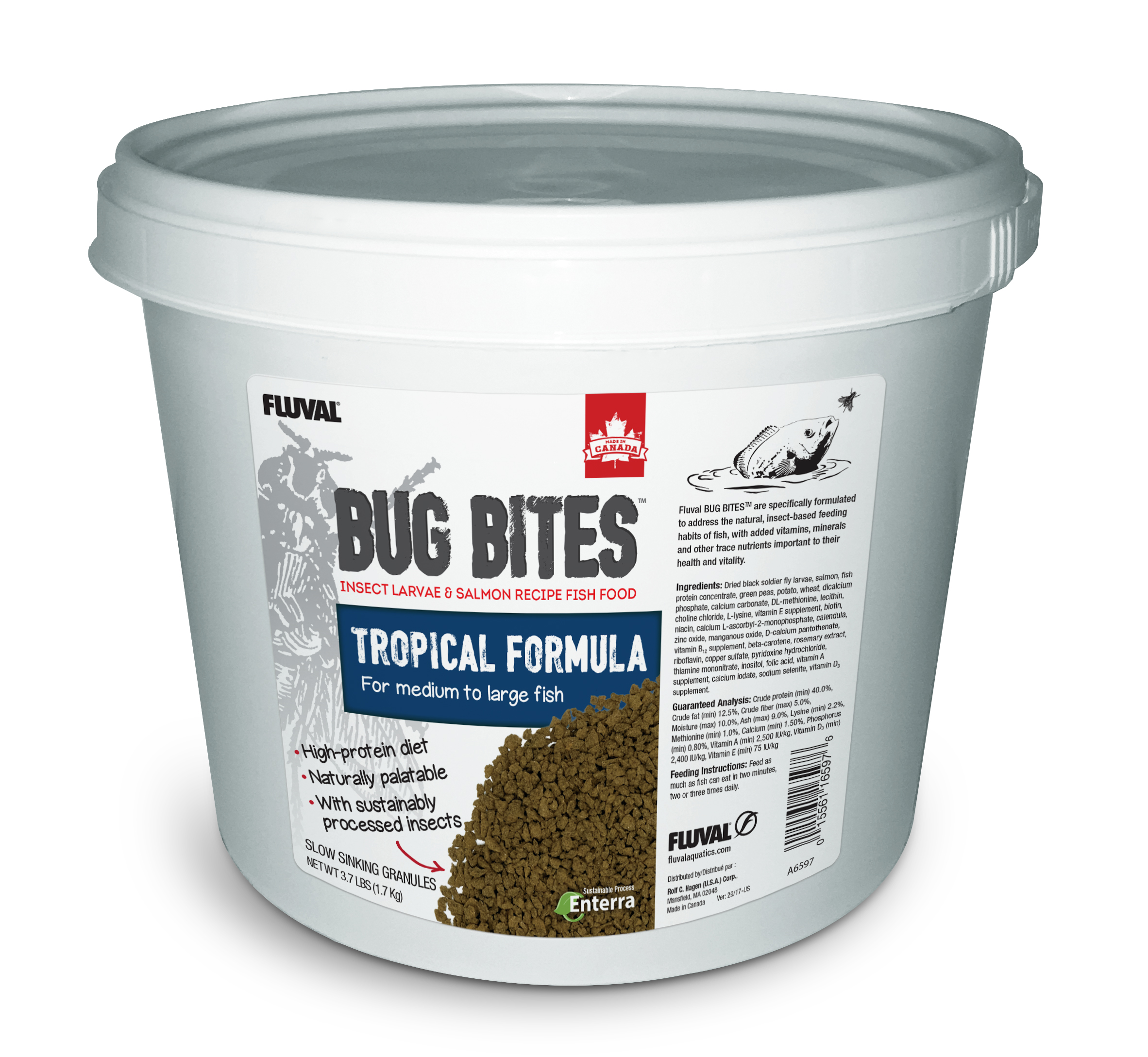 Fluval Bug Bites ist ein hochwertiges und nahrhaftes Fischfutter in Form von langsam sinkendem Granulat für tropische Fische. Die Rezeptur basiert auf Larven der Schwarzen Soldatenfliege und ist besonders reich an Eiweiß. Das Futter enthält keine künstlichen Farbstoffe oder Konservierungsstoffe und unterstützt die Entwicklung gesunder Haut, Schuppen und Flossen sowie kräftiger Farben. Die Zusammensetzung sorgt für eine hohe Akzeptanz und wird auch von wählerischen Fischen gern gefressen.