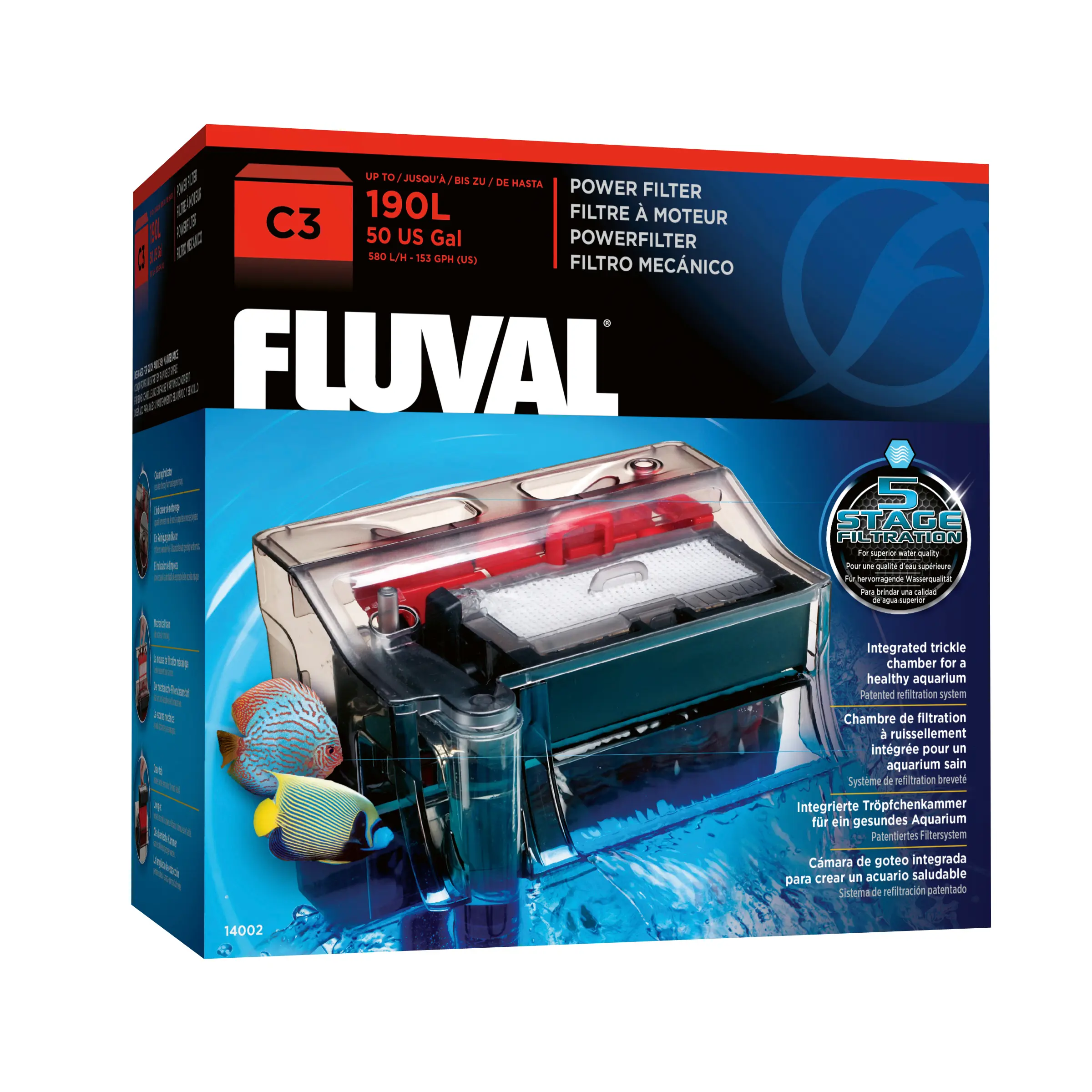 Fluval C3 Clip-On Filter sorgt für zuverlässig sauberes Wasser und bietet eine umfassende Filterleistung für Aquarien von 75 bis 190 Litern. Durch das ausgeklügelte 5-Stufen-Filtersystem werden Schmutzpartikel, Schadstoffe und unangenehme Gerüche effektiv entfernt. Dank bequemer Handhabung und aller enthaltenen Filtermedien können Sie den Filter direkt anschließen und sofort in Betrieb nehmen. Ein optischer Reinigungsindikator erleichtert zusätzlich die Wartung und sorgt für optimal laufende Filterleistung.