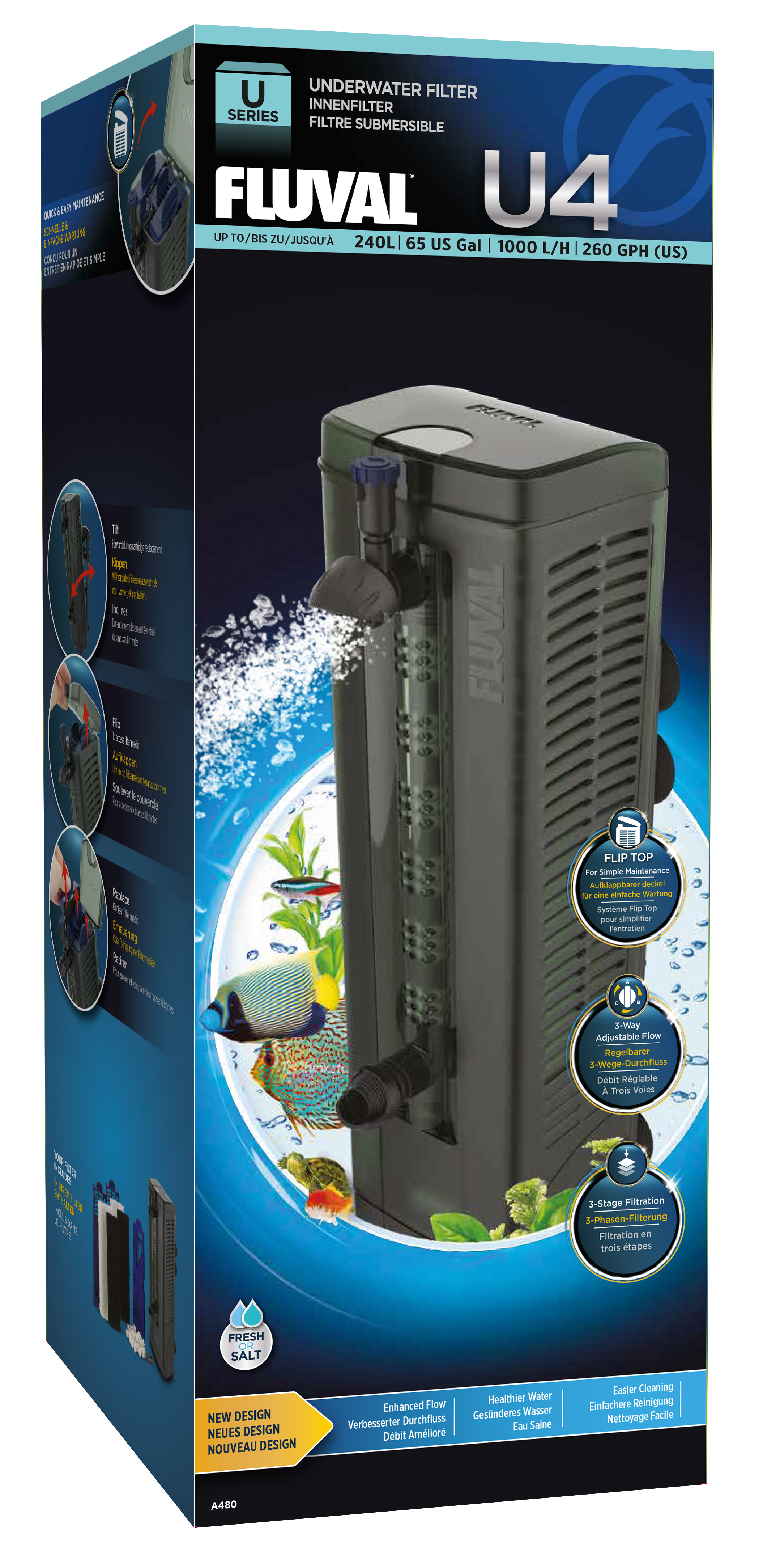 Fluval U4 Innenfilter sorgt zuverlässig für sauberes und gesundes Wasser in Ihrem Aquarium. Dieses Modell ist ideal geeignet für Aquarien von 130 bis 240 Litern und überzeugt durch seine dreistufige Filtertechnik, die sowohl grobe als auch feine Schmutzpartikel entfernt und eine optimale biologische Filterung bietet.