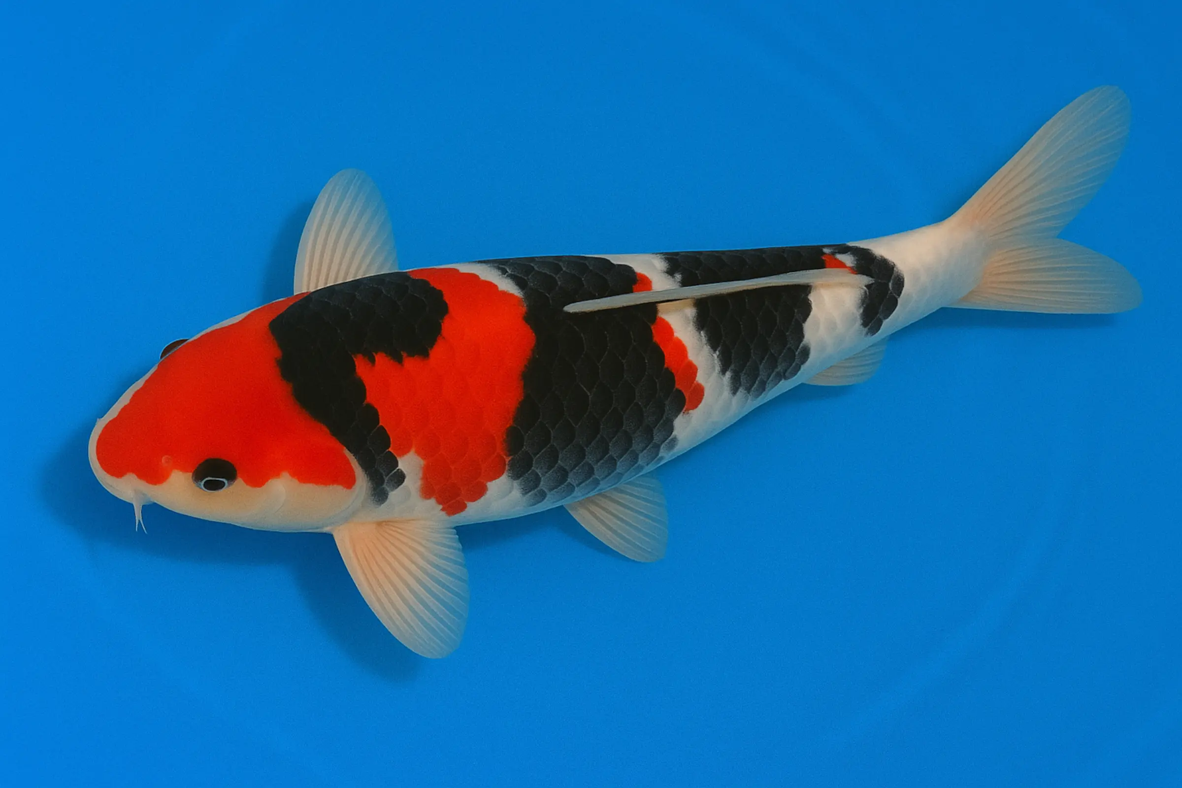 Der Japan Koi Hosokai Tosai Showa ist ein junger, meist einjähriger Showa-Koi aus der renommierten japanischen Zuchtlinie von Hosokai. Als klassische Vertreter der Varietät Showa Sanshoku tragen diese Fische die charakteristischen drei Farben Schwarz (Sumi), Rot (Hi) und Weiß (Shiro) auf einem meist dunklen Grundkörper. Die schwarze Grundfarbe ist bei Showa-Kois genetisch dominant, wobei sich schwarze Bänder oft weit über Rücken, Flanken und auch den Kopf ziehen – ein klares Unterscheidungsmerkmal zum ähnlich gefärbten Sanke-Koi, bei dem die schwarze Zeichnung niemals den Kopf berührt. Die Verteilung von Rot, Schwarz und Weiß variiert bei jedem Tier stark, was jeden Showa-Koi zu einem individuellen Einzelstück macht.
