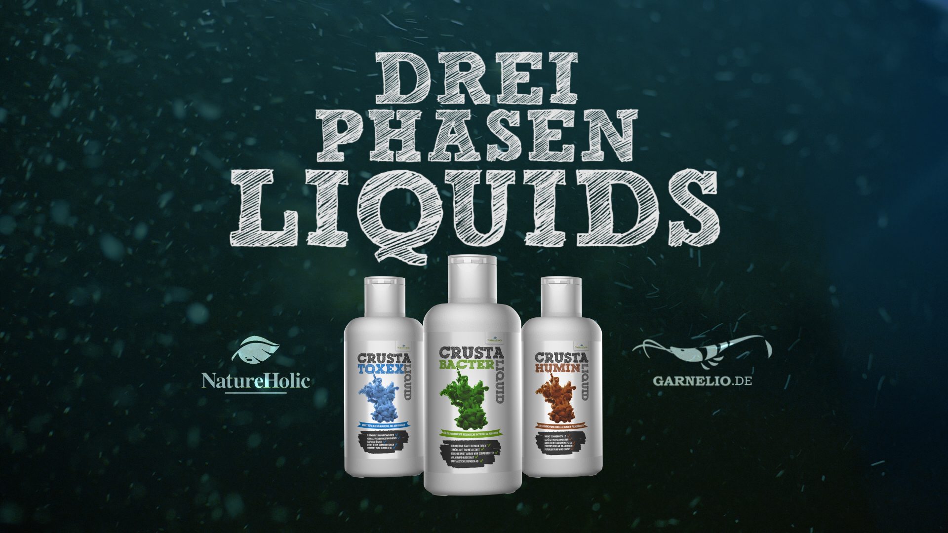 NatureHolic 3 Phasen Liquid Pflegeset enthält drei Flaschen zu je 125 ml mit den Produkten ToxEx Liquid, Humin Liquid und Bacter Liquid. Die Kombination bietet natürliche Wirkstoffe, darunter Huminsäuren und probiotische Mikroorganismen zur biologischen Wasseraufbereitung.