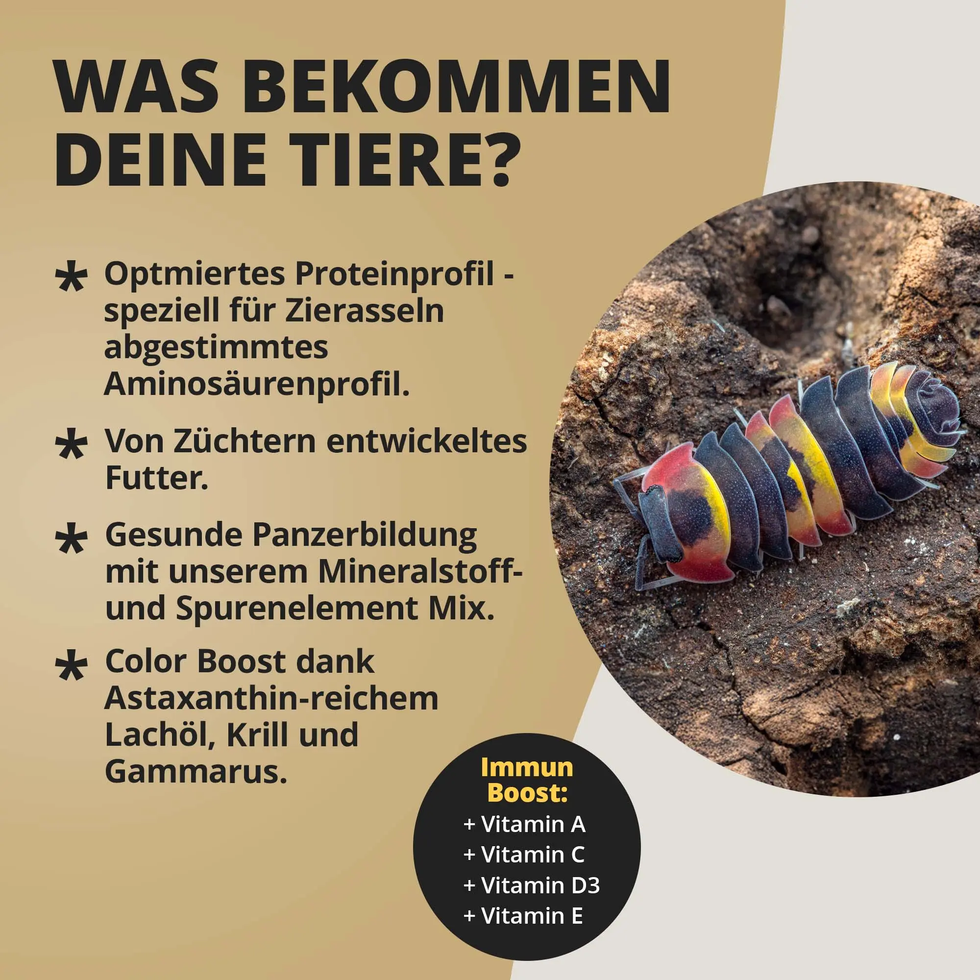 - Spezieller Vitamin- und Spurenelement-Mix, abgestimmt auf Bedürfnisse von Asseln im Terrarium