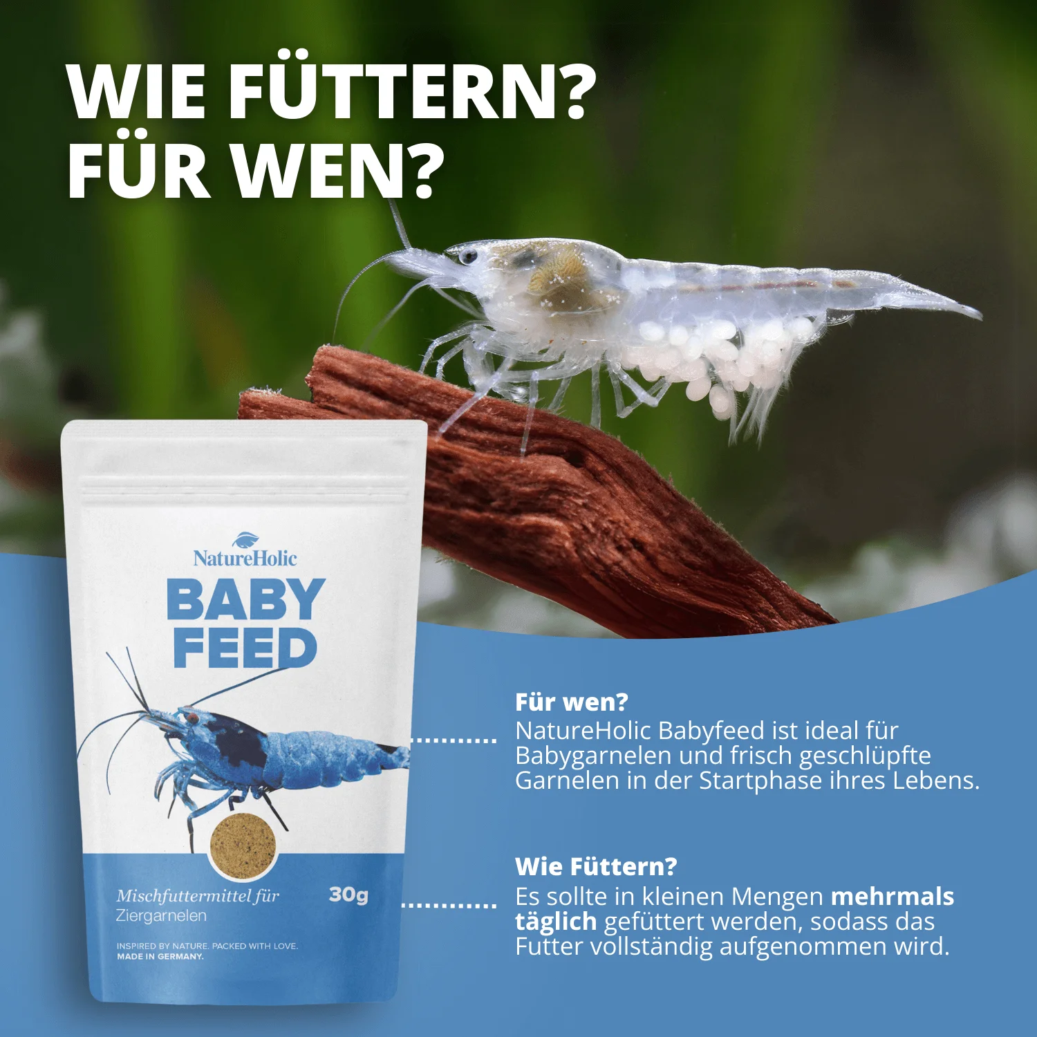NatureHolic Babyfeed ist ein spezialisiertes Aufzuchtfutter für Babygarnelen, das durch mikrofeine Körnung, hochwertige natürliche Zutaten und gezielten Vitamin- und Mineralstoffmix das gesunde Wachstum, die Häutung und das Immunsystem junger Garnelen optimal unterstützt.