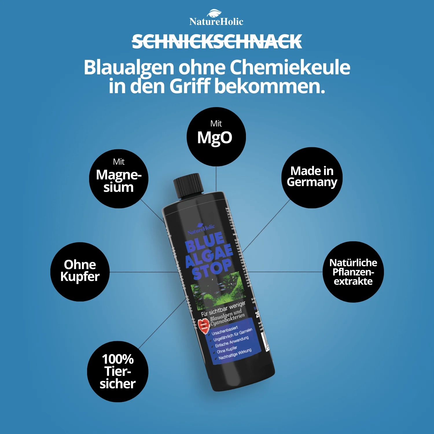 NatureHolic Blue Algae Stop ist eine innovative Mg-Dünger-Lösung zur effektiven Bekämpfung von Blaualgen (Cyanobakterien), Schmieralgen und Schleimalgen in Aquarien. Die spezielle Formel gleicht Nährstoffungleichgewichte aus, stärkt die Pflanzen und sorgt auf natürliche Weise dafür, dass lästige Algen ihre Lebensgrundlage verlieren – ganz ohne Kupfer oder giftige Substanzen.