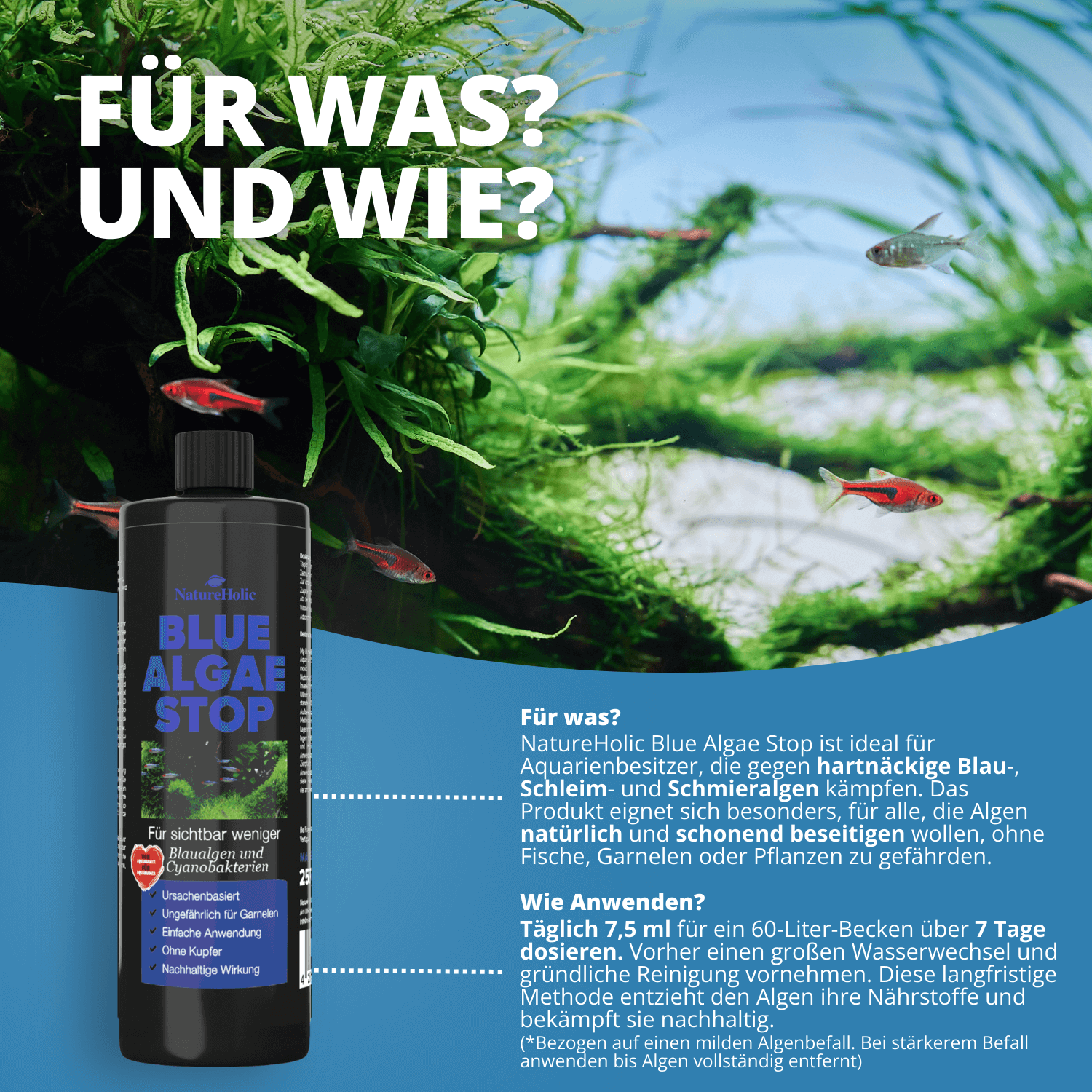 Vor der Anwendung sollten ein großer Wasserwechsel (mind. 50%) und die gründliche Reinigung von Mulm und abgestorbenen Pflanzenteilen durchgeführt werden. Über 7 Tage täglich 10 ml NatureHolic Blue Algae Stop je 80 Liter Aquarienwasser zugeben. Nach 14 Tagen erfolgt ein erneuter großzügiger Wasserwechsel und die Zugabe von NatureHolic Bacter Liquid zur Stärkung der Bakterienflora. Bei anhaltendem Befall wird die Anwendung wiederholt und das Aquarium für 7 Tage lichtdicht abgedeckt. Für die Vorbeugung genügt eine wöchentliche Zugabe von 10 ml pro 80 Liter Wasser.