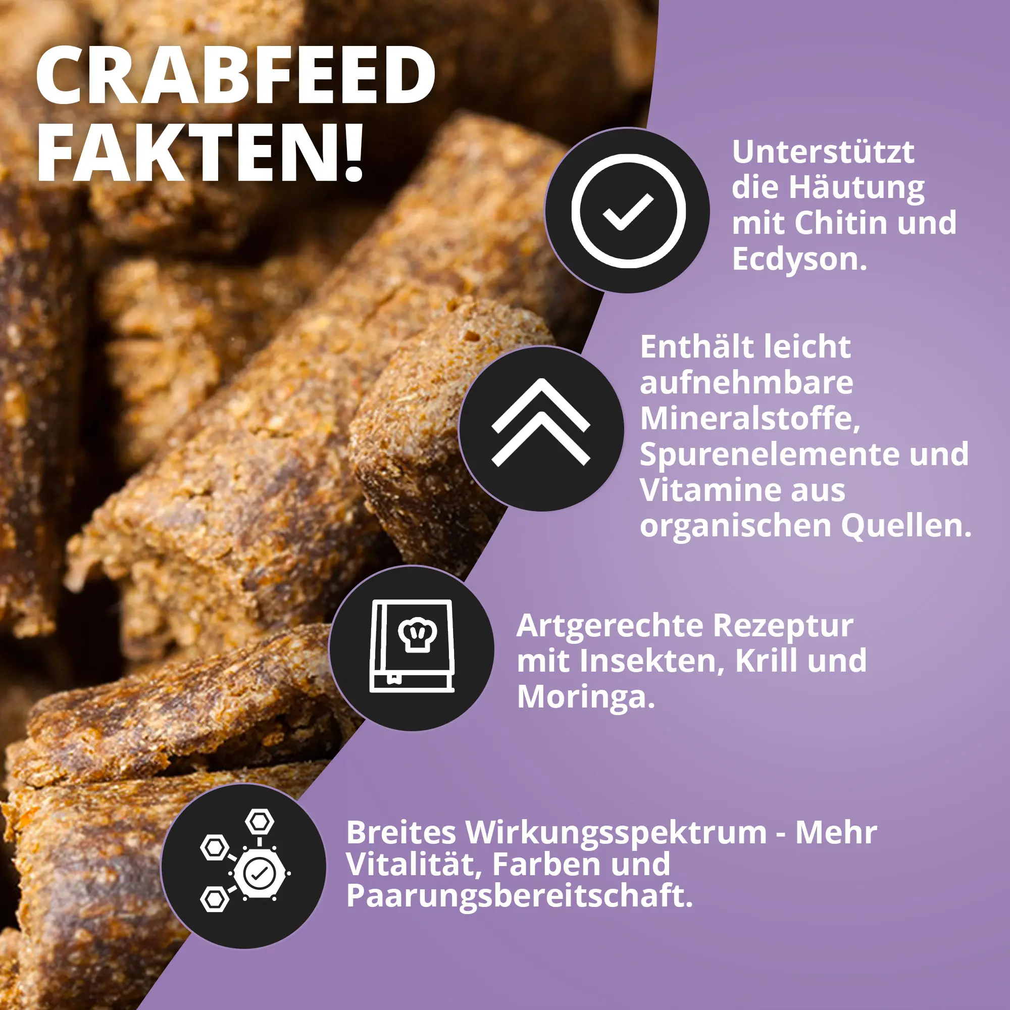 NatureHolic Crabfeed ist ein speziell entwickeltes Hauptfutter für Zier- und Aquarienkrabben. Die Crabfeed Sticks orientieren sich an der natürlichen Ernährung omnivorer Krabben und bieten eine fein abgestimmte Mischung aus tierischen sowie pflanzlichen Zutaten. Die Rezeptur wurde dazu entwickelt, die Häutung, Verdauung, das Wachstum sowie die Fortpflanzung Ihrer Krabben optimal zu unterstützen.