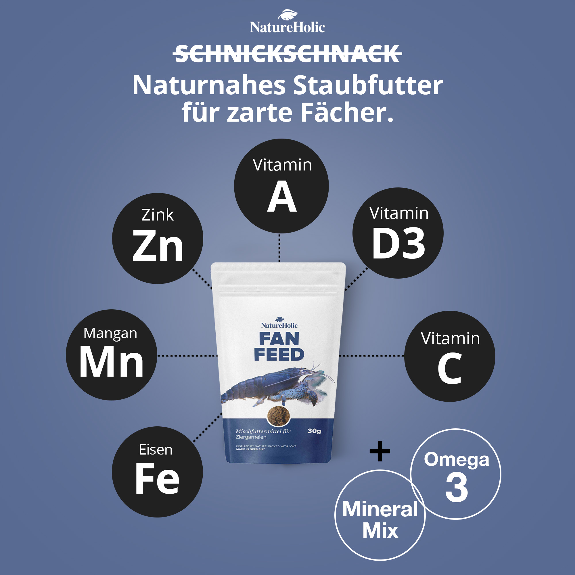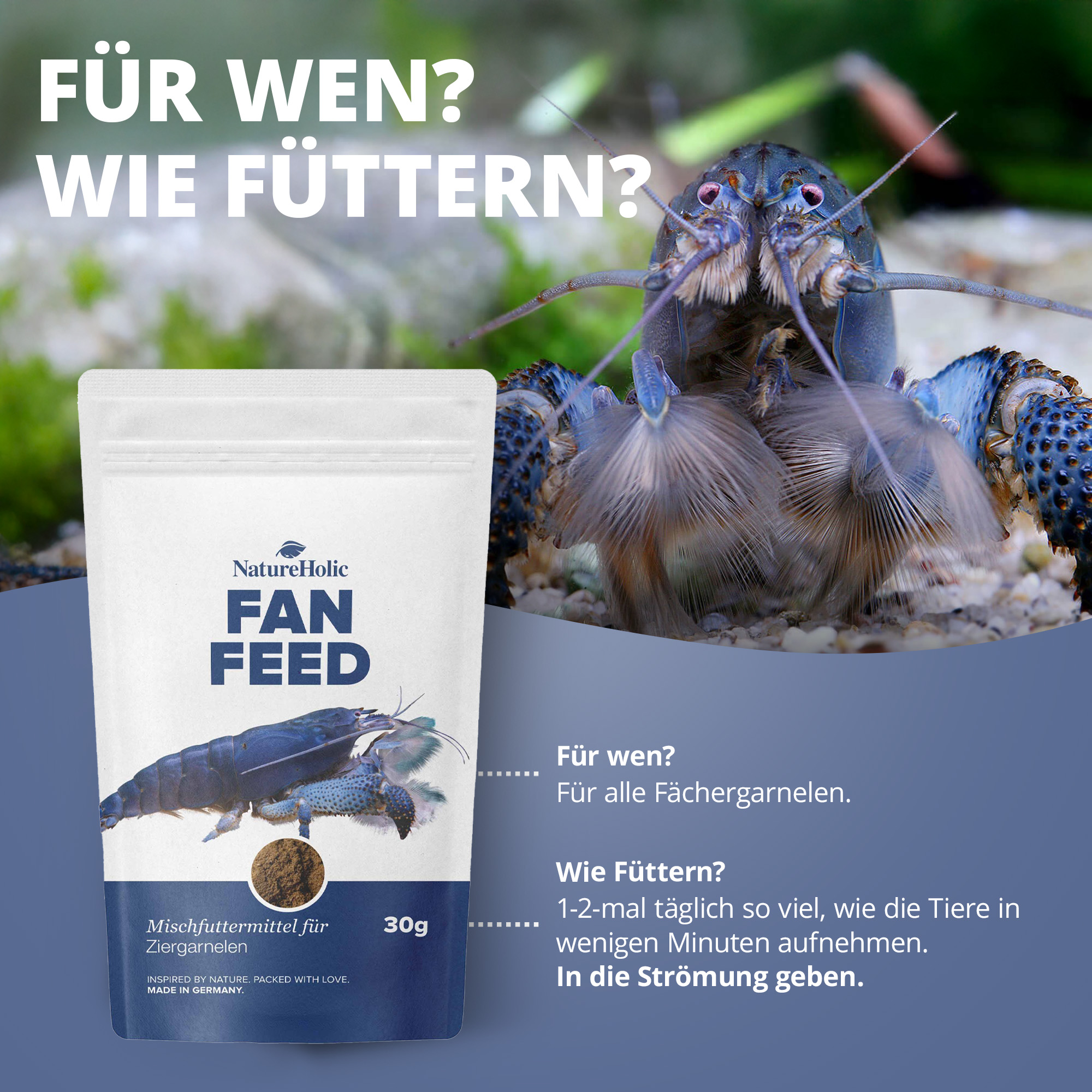 NatureHolic Fanfeed Fächergarnelenfutter bietet ein sorgfältig abgestimmtes Nährstoffprofil für Fächergarnelen. Mit hochwertigem Protein, wertvollen Fettsäuren, Vitaminen und Mineralstoffen trägt es optimal zur Vitalität, Häutung und zum gesunden Wachstum der Tiere bei.