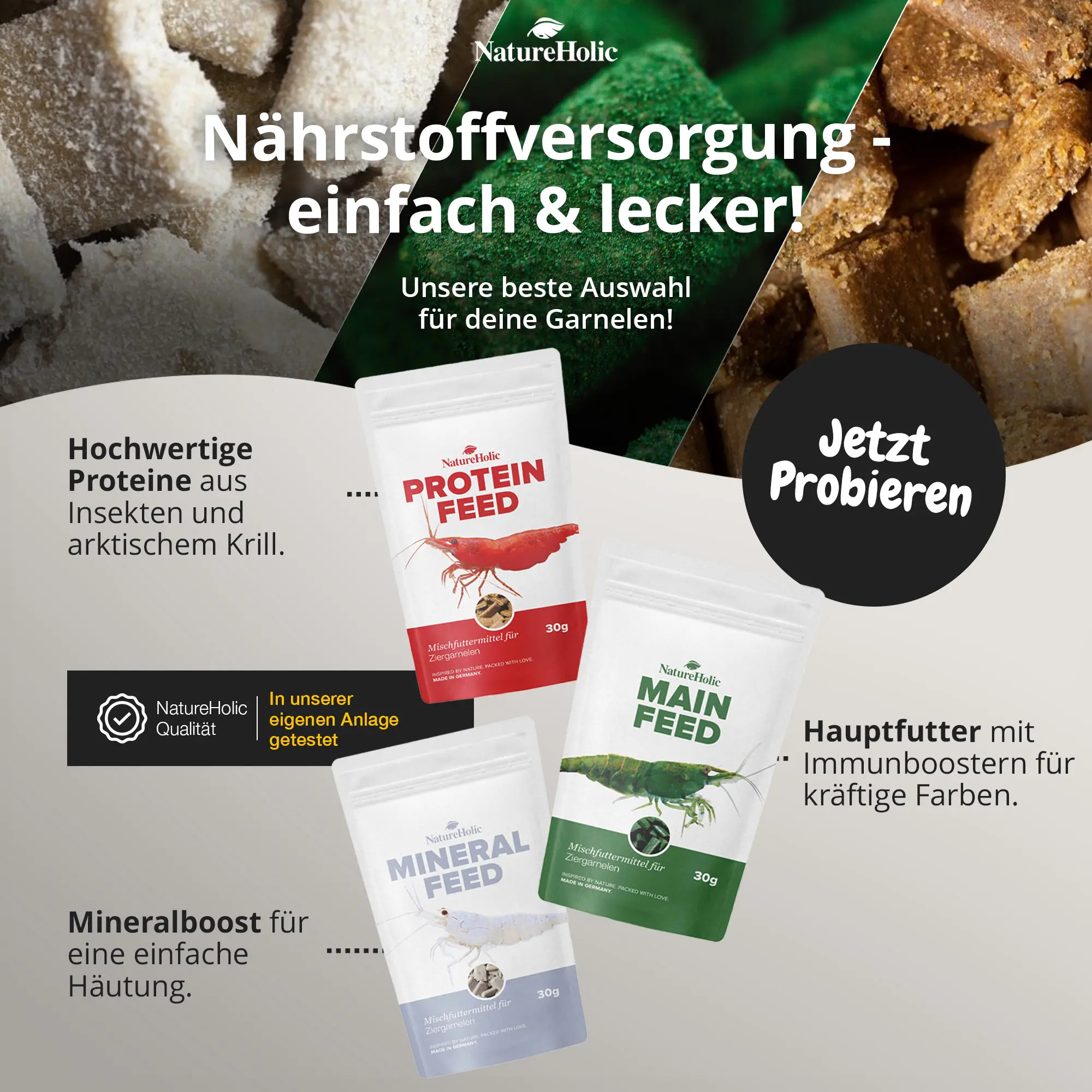 NatureHolic Futter Paket, Mainfeed + Proteinfeed + Mineralfeed, Garnelenfutter, 3 x 30 g