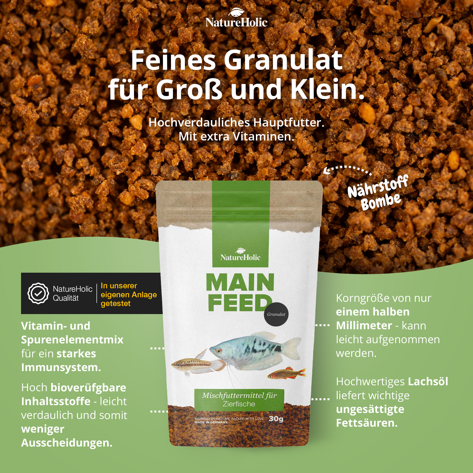 NatureHolic Hauptfeed Mainfeed Granulat ist ein ausgewogenes Premium-Hauptfutter für Aquarienfische. Es überzeugt durch hohe Akzeptanz, exzellente Nährstoffzusammensetzung und klare Wasserqualität – entwickelt und hergestellt in Deutschland.