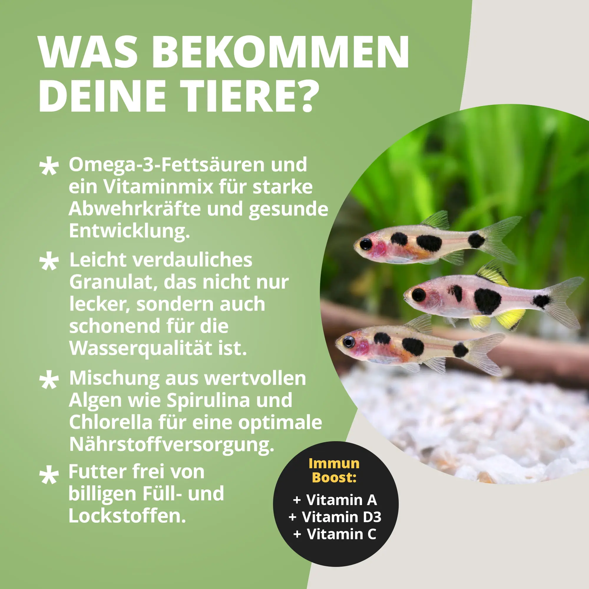 NatureHolic Hauptfeed Mainfeed Granulat ist ein hochwertiges, professionelles Fischfutter speziell für Aquarienfische. Das feine Granulat mit einer Korngröße von 0,5 mm wird von kleinen bis mittelgroßen Fischen optimal aufgenommen. Dank ausgesuchter Zutaten liefert das Futter essentielle Omega-3-Fettsäuren aus Lachsöl sowie einen hochdosierten Vitamin- und Spurenelementmix – speziell zur Vorbeugung von Mangelerscheinungen bei Zierfischen. Das Futter wird gierig angenommen und sorgt durch seine hohe Verdaulichkeit für klare Wasserverhältnisse.
