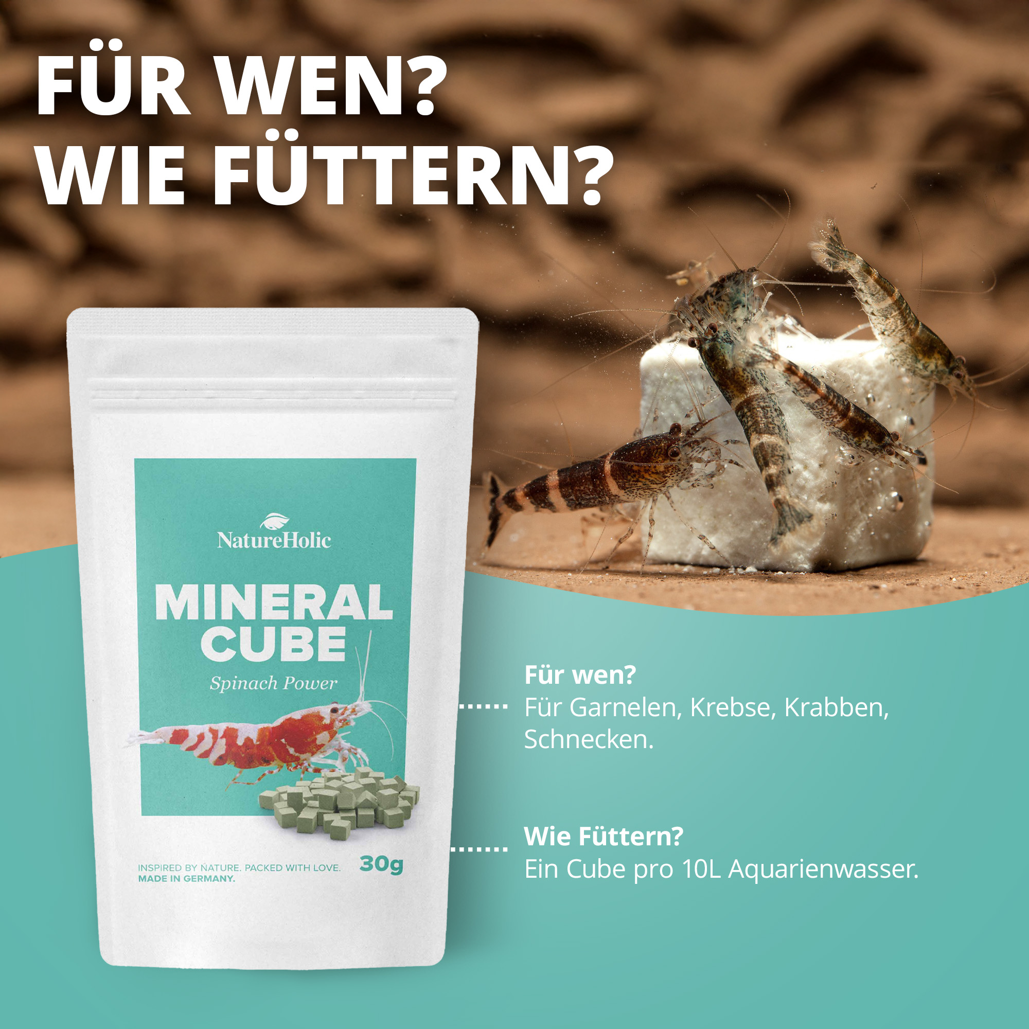 NatureHolic MineralCube Spinach Power ist ein durchdachtes Mineralfutter, das wirbellosen Aquarientieren eine zuverlässige Mineralstoffquelle bietet und gleichzeitig dank des Spinatanteils wertvolle Vitamine und Mineralien liefert. Es unterstützt die Gesundheit und Reparatur von Panzern und Gehäusen und ist dabei einfach in der Anwendung und nachhaltig für die Wasserqualität.
