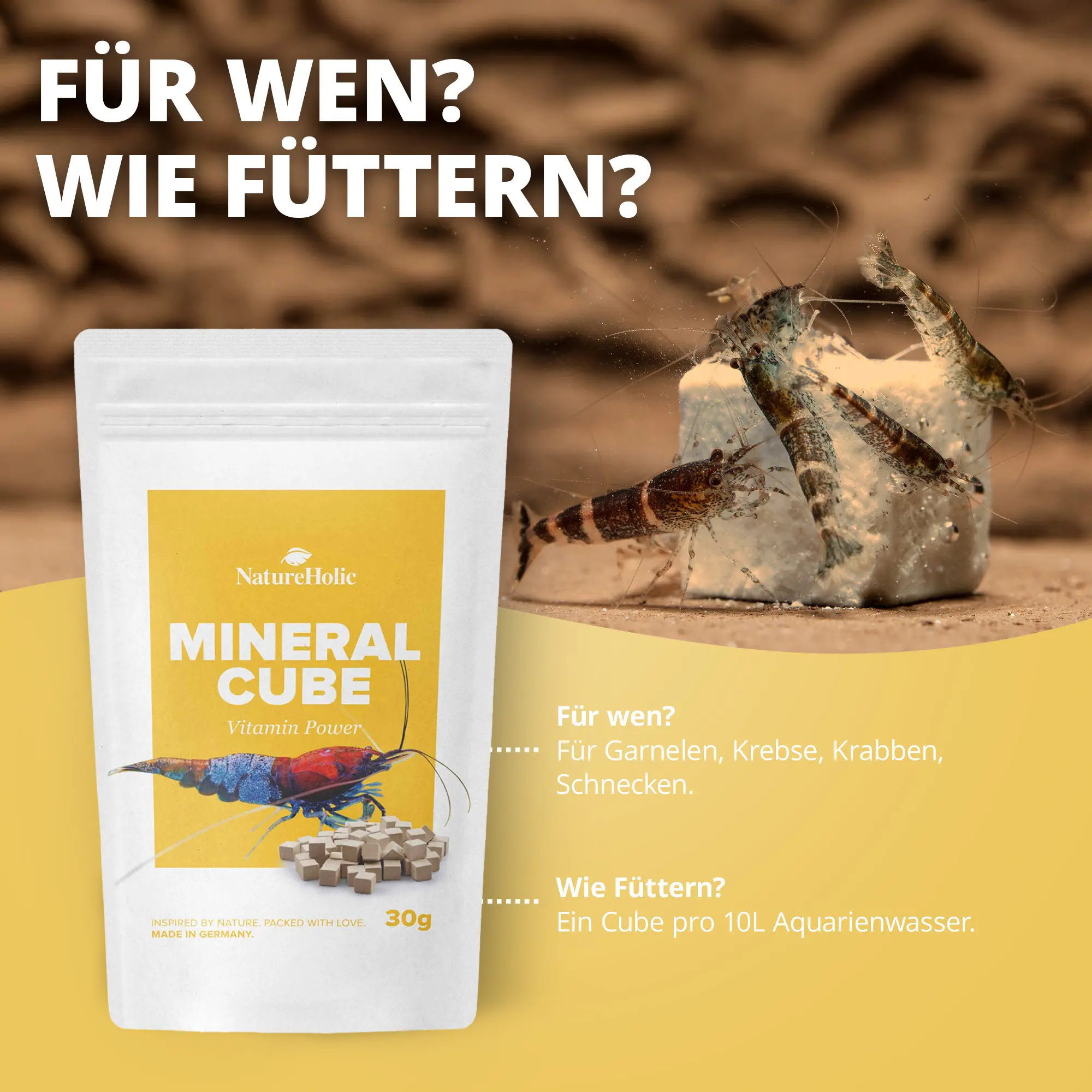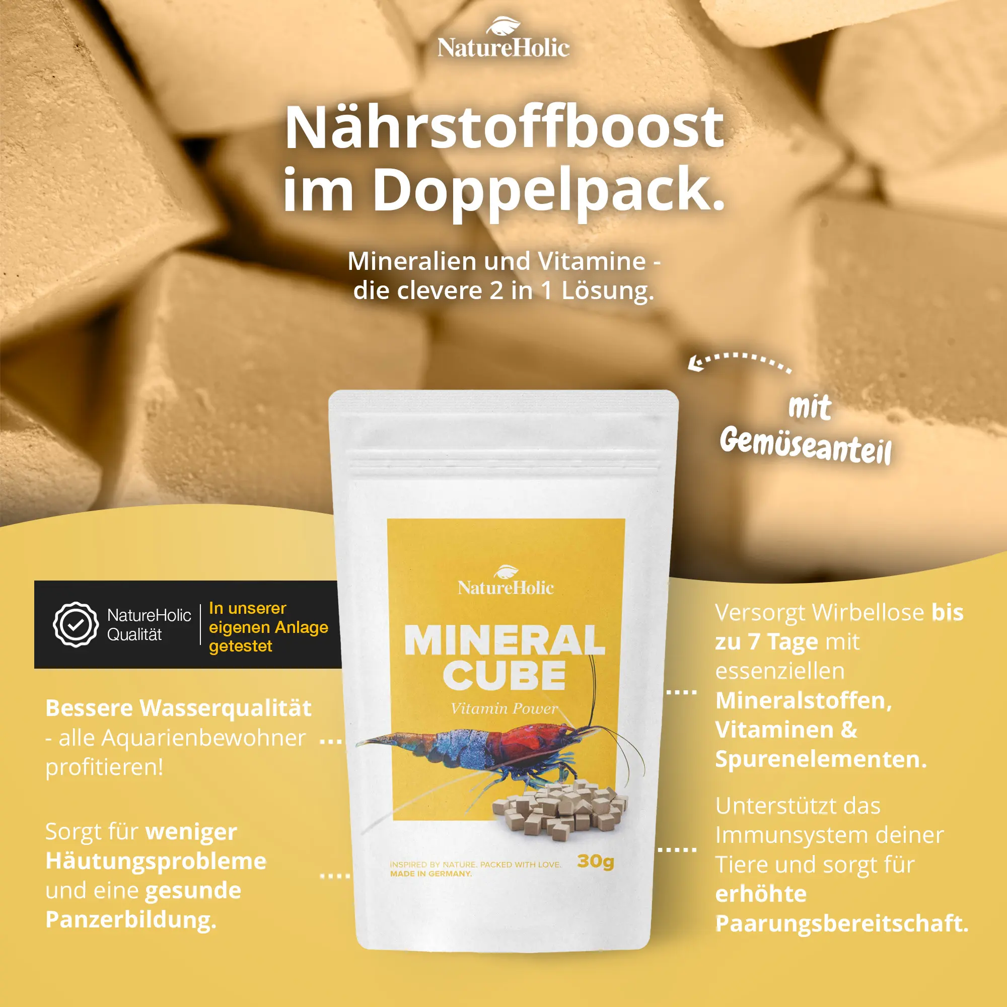 NatureHolic MineralCube Vitamine Power ist eine innovative Lösung zur Mineralstoffversorgung von Garnelen, Schnecken, Krebsen und Krabben. Die Cubes versorgen Aquarienbewohner zuverlässig mit wichtigen Mineralstoffen und Vitaminen, die besonders für den Panzeraufbau, einen stabilen Stoffwechsel und die allgemeine Gesundheit entscheidend sind. Als ideales Ferienfutter sorgen sie dafür, dass Wirbellose bis zu 7 Tage bestens versorgt sind, selbst wenn der Halter unterwegs ist. Die langsam löslichen Würfel setzen Nährstoffe und Mineralien schonend frei, ohne das Wasser zu belasten.