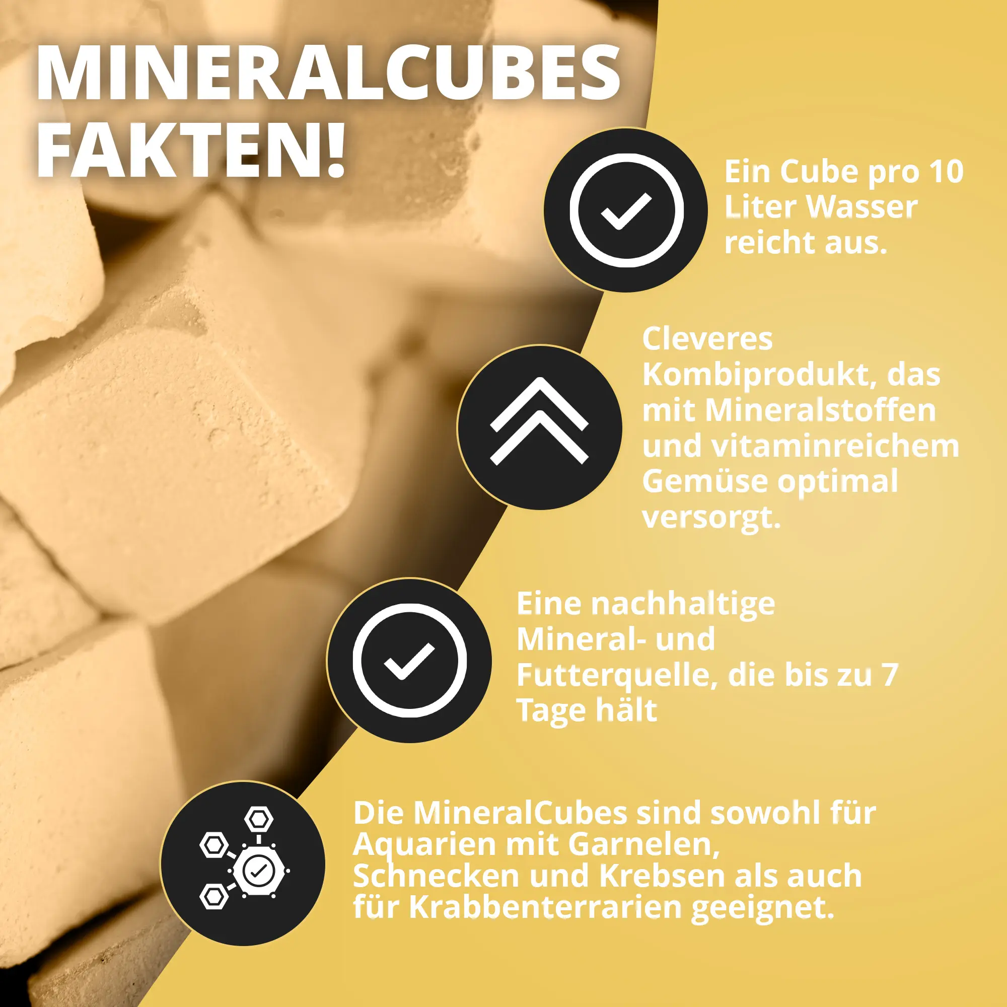 Einfach einen MineralCube pro 10 Liter Beckenvolumen ins Aquarium oder Terrarium geben. Die Tiere nehmen die Mineralstoffe nach Bedarf direkt am Cube auf, während Nährstoffe langsam und schonend ans Wasser abgegeben werden.