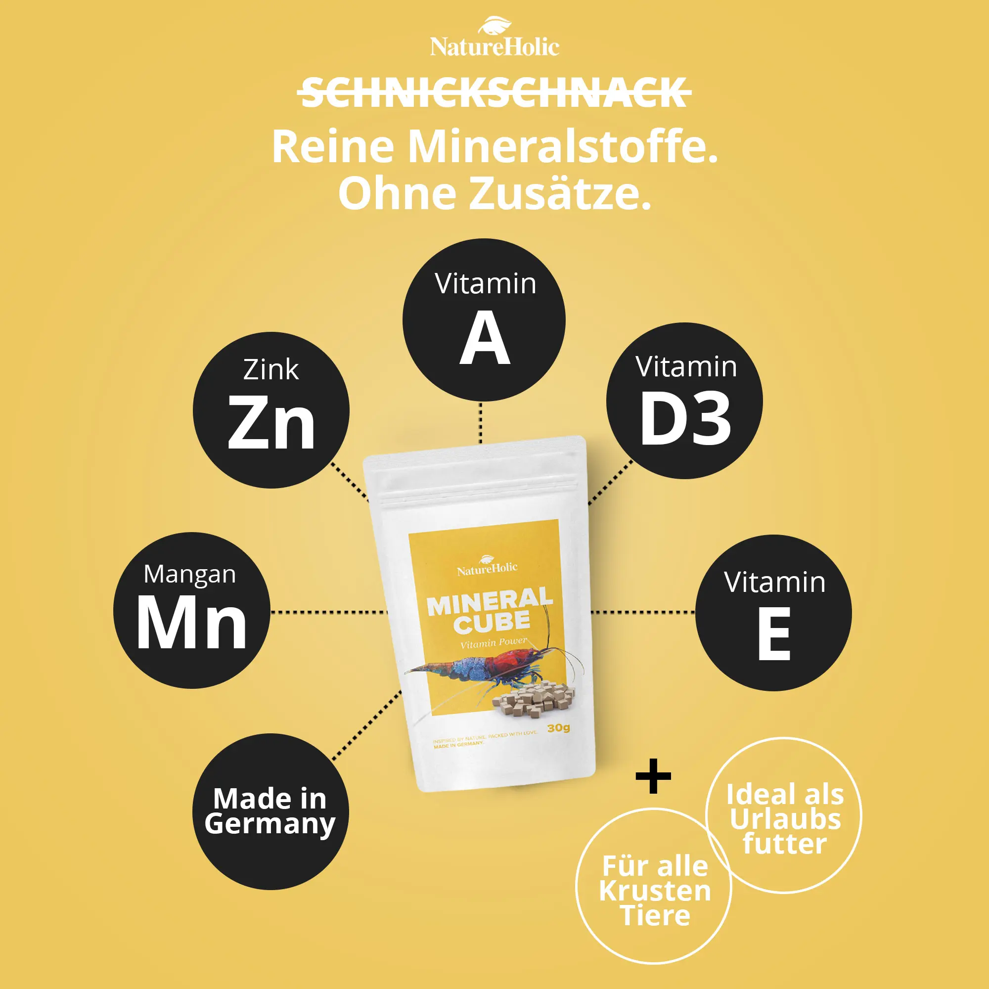 NatureHolic MineralCube Vitamine Power enthält eine Kombination aus Mineralstoffen und Gemüse (4%). Ernährungsphysiologisch zugesetzte Stoffe/kg: Vitamin A (234 I.E.), Vitamin D3 (390 I.E.), Vitamin E (47 mg), Eisen(II)sulfat (9 mg), Zinkoxid (18 mg), Mangan-II-oxid (2 mg), Calciumjodat (2 mg).