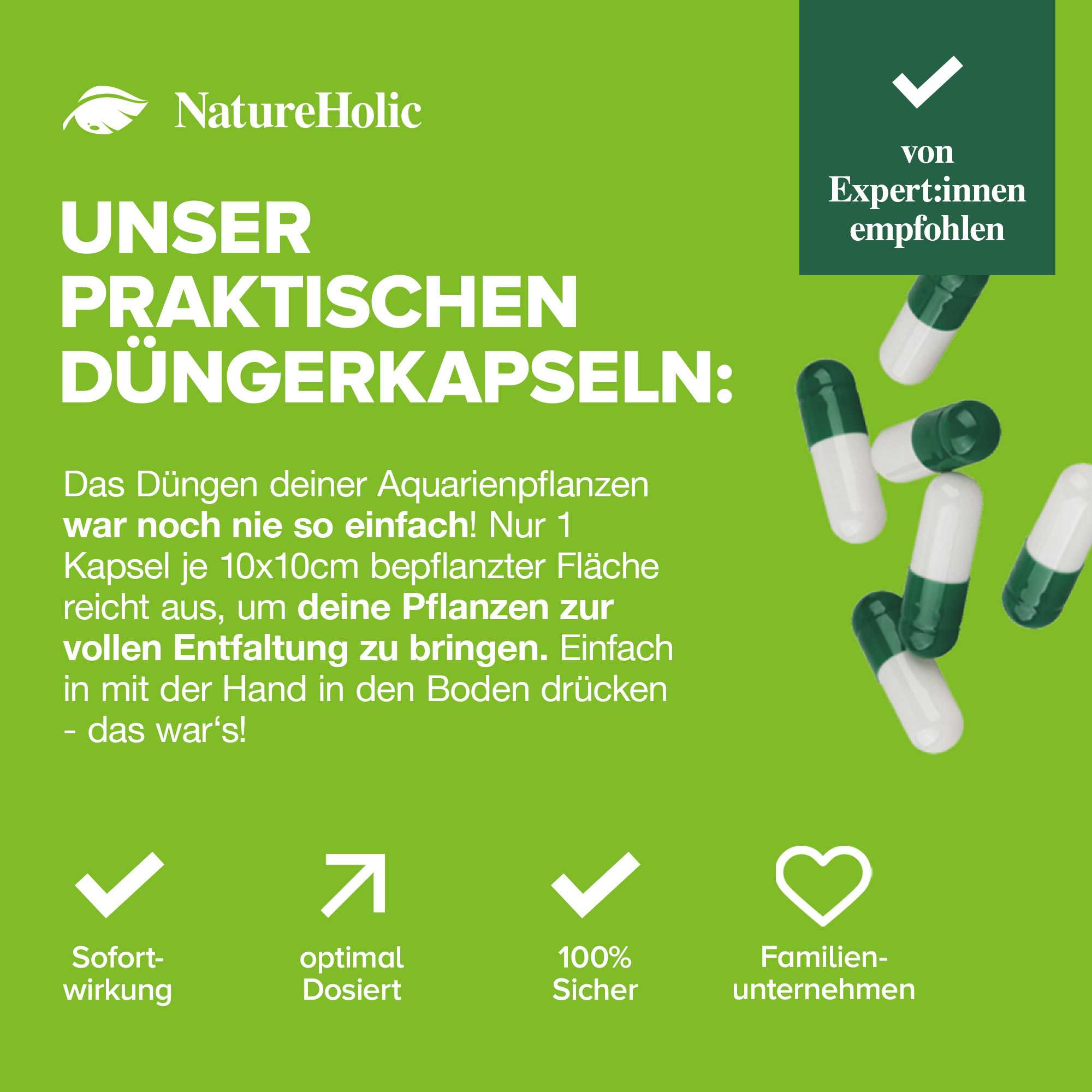 Alle 2 Monate 1 Kapsel je 10×10 cm bepflanzter Fläche in den Bodengrund drücken. NatureHolic NutriCaps sind ausschließlich zur Düngung von Zierpflanzen in Aquarien vorgesehen; detaillierte Anwendung und Dosierung sind der Packungsangabe zu entnehmen.