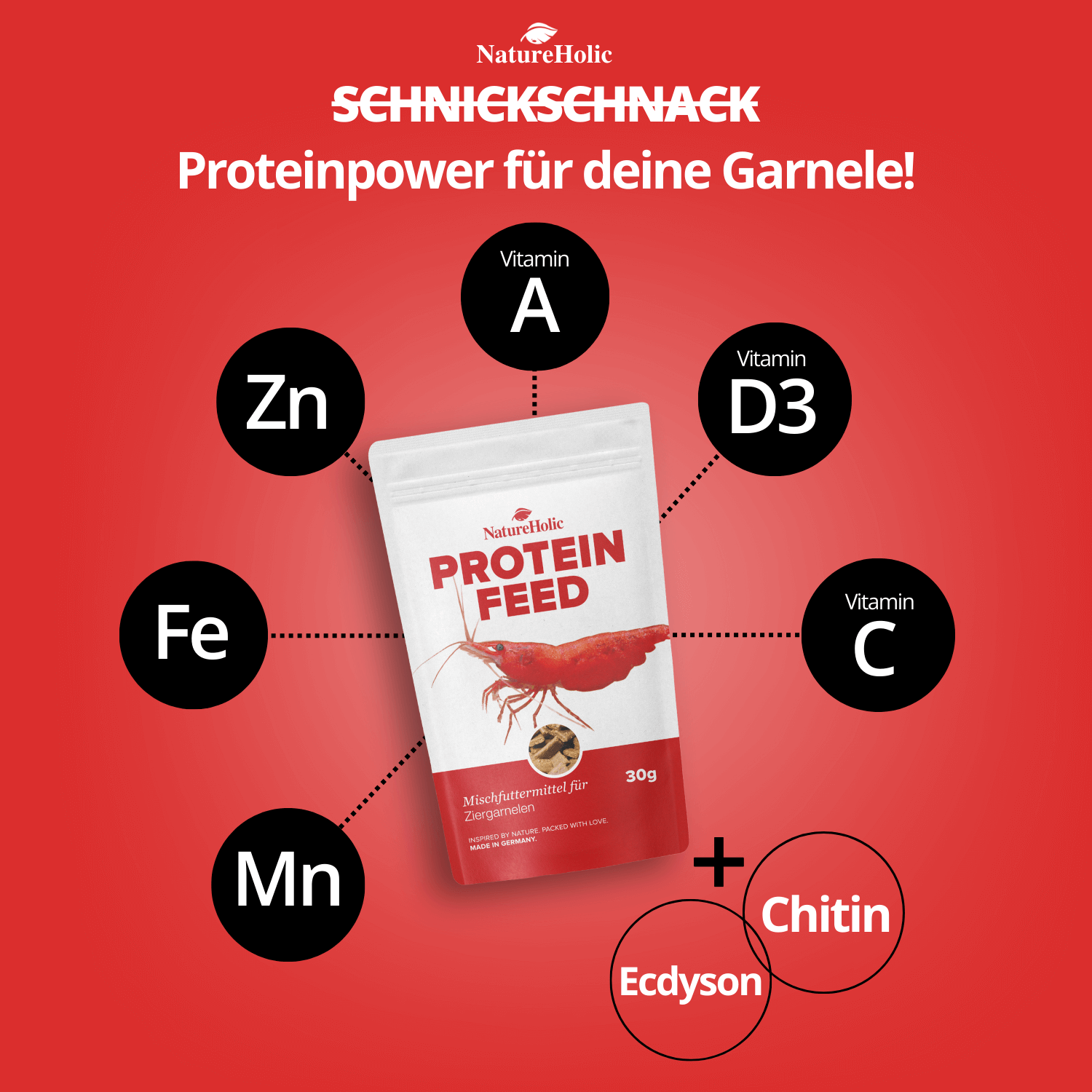 NatureHolic Proteinfeed Garnelenfutter ist ein speziell entwickeltes Proteinfutter für Garnelen mit erhöhtem Eiweißbedarf. Ideal für Wachstum, Zuchtphasen und für Arten wie Macrobrachium oder carnivore Zwergkrebse, Krabben sowie für weibliche Amanogarnelen, die mehr Proteine benötigen. Das Futter trägt gezielt zur Eiausbildung und zur Verbesserung der Eiqualität bei.