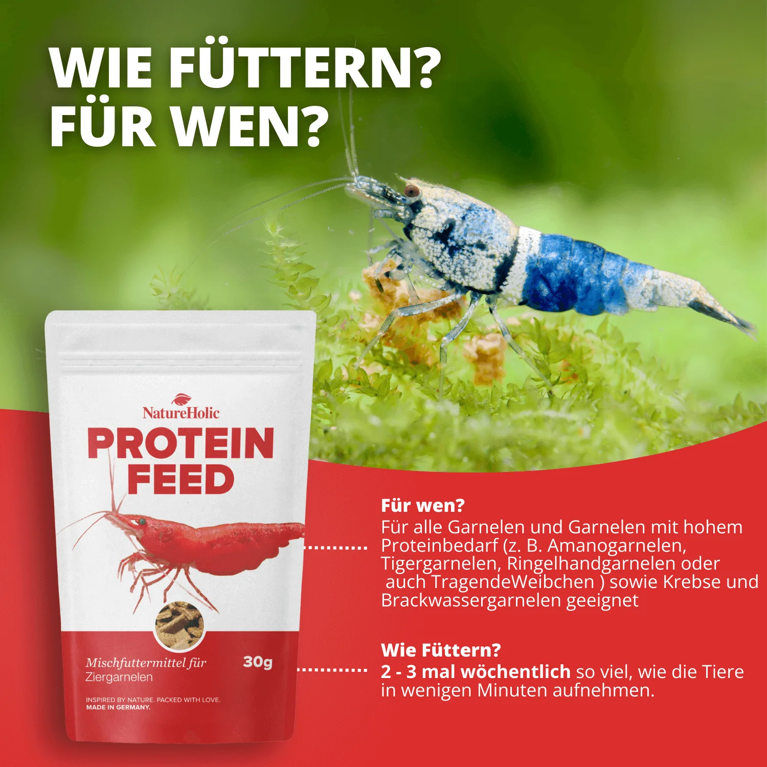 NatureHolic Proteinfeed Garnelenfutter ist das ideale Ergänzungsfutter für Ziergarnelen, Zwergkrebse, Krebse und Krabben mit erhöhtem Proteinbedarf. Es unterstützt gezielt Wachstum, Fortpflanzung, Häutung und die Ausbildung eines robusten Exoskeletts.