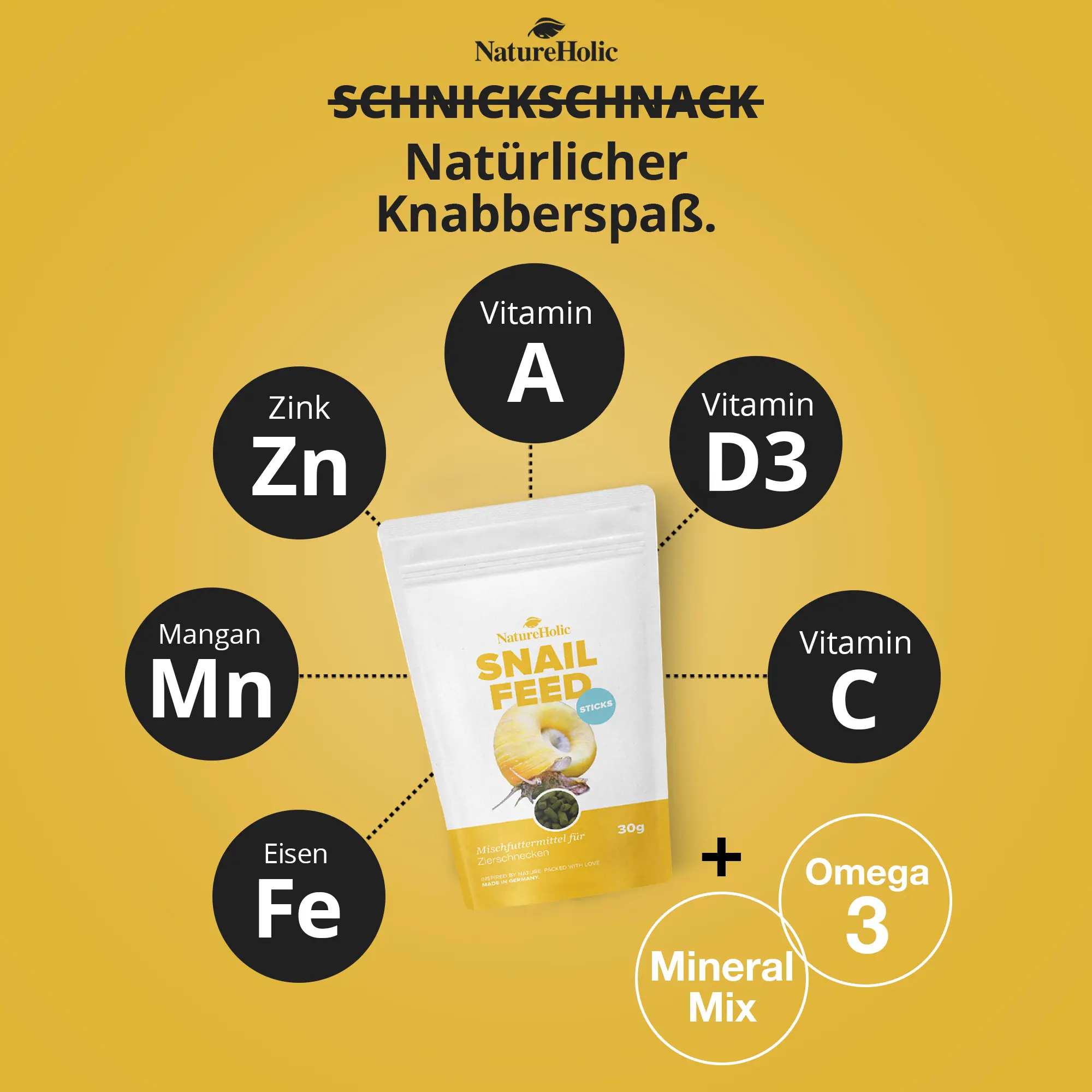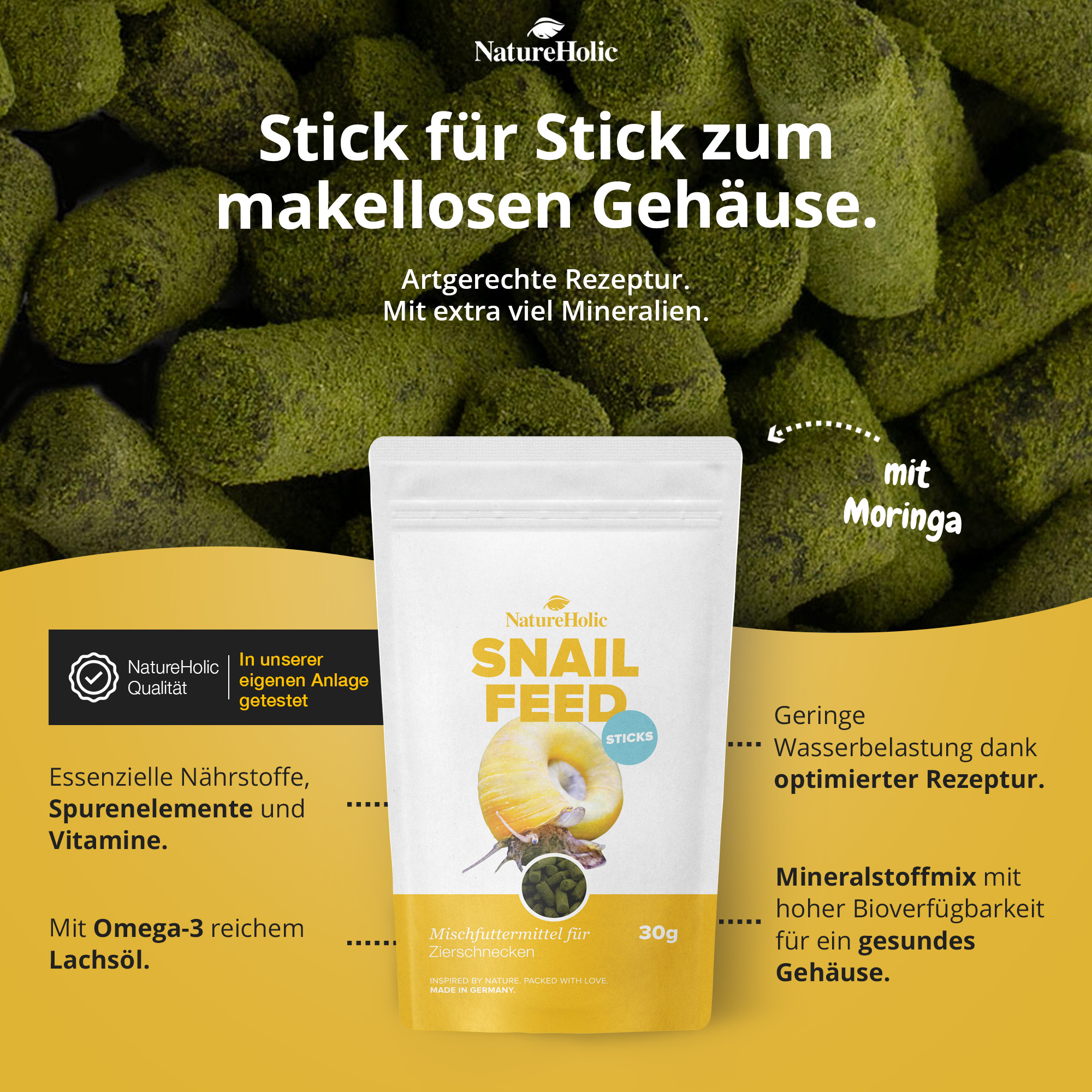 NatureHolic Snailfeed Sticks enthalten pflanzliche Nebenerzeugnisse, Spirulina, Insekten, Getreide, pflanzliche Eiweißextrakte, Moringa (9 %), Mineralstoffe (4 %), Lachsöl, pflanzliche Erzeugnisse, Hefen und Gemüse. Ernährungsphysiologische Zusatzstoffe pro kg: Vitamin A 9985 I.E., Vitamin C 75 mg, Vitamin D3 749 I.E., Eisen 12 mg, Mangan 15 mg, Zink 15 mg. Analytische Bestandteile: Rohprotein 14,5 %, Rohfett 3,2 %, Rohfaser 2,3 %, Rohasche 8,1 %.