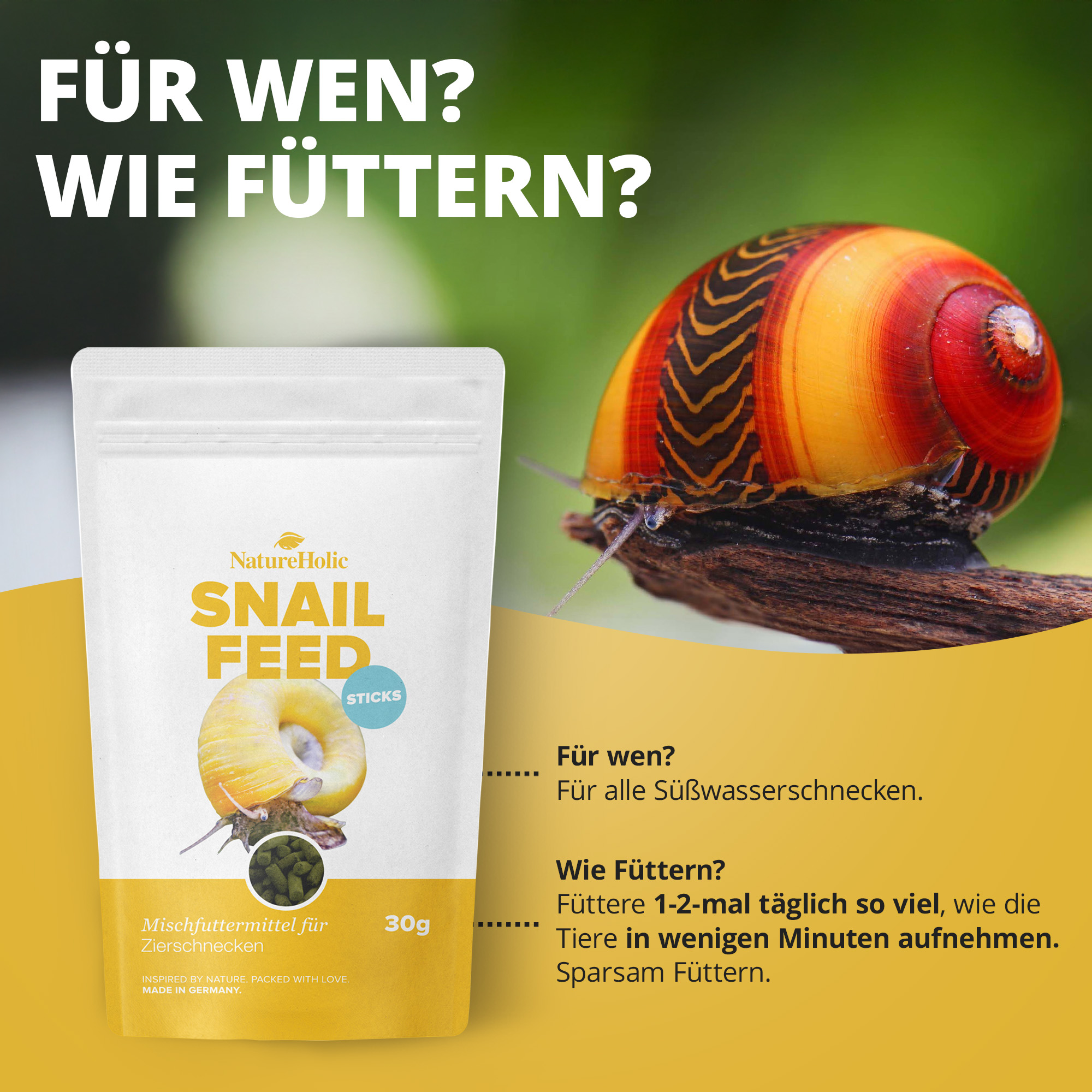NatureHolic Snailfeed Sticks bieten eine bedarfsgerechte, gesunde Ernährung für Aufwuchs fressende Aquarienschnecken. Dank wertvoller Mineralien, Vitamine sowie hochwertiger Proteine fördern sie Wachstum, Gehäuseaufbau und die Gesundheit der Tiere – selbst bei sensiblen Wildfängen oder nach Transportstress.