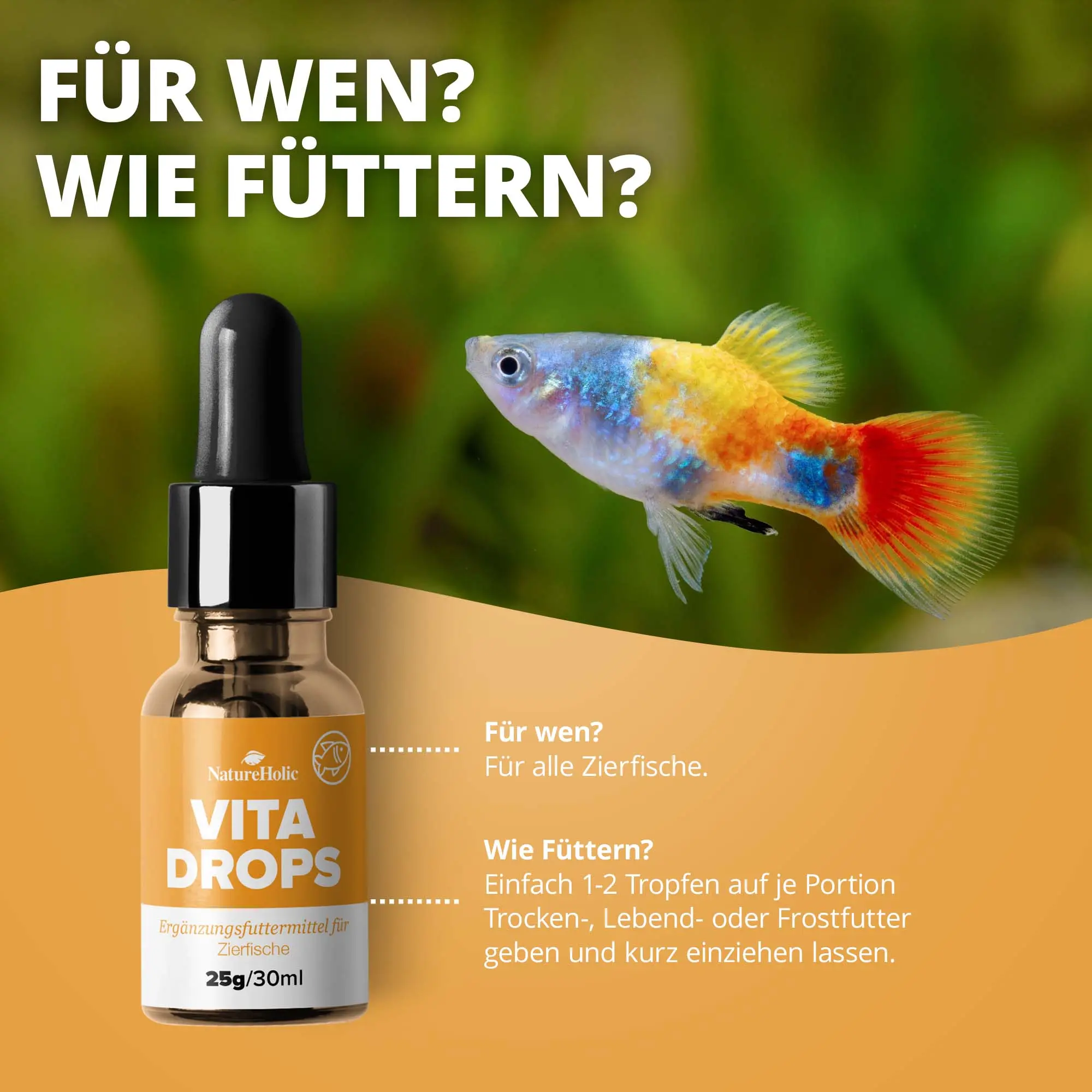 NatureHolic Vita Drops Fish ist ein spezieller Futterzusatz für Zierfische im Aquarium, der gezielt Lebendfutter und Frostfutter mit essentiellen Vitaminen und Spurenelementen anreichert. Die vitalstoffreiche Spezialmischung unterstützt das Wohlbefinden, sorgt für strahlende Farben und eine erhöhte Vitalität bei Fischen und Wirbellosen. Auch Garnelen, Schnecken, Zwergkrebse sowie Krebse und Krabben profitieren von diesem Präparat, das absolut unbedenklich im Gesellschaftsaquarium eingesetzt werden kann.