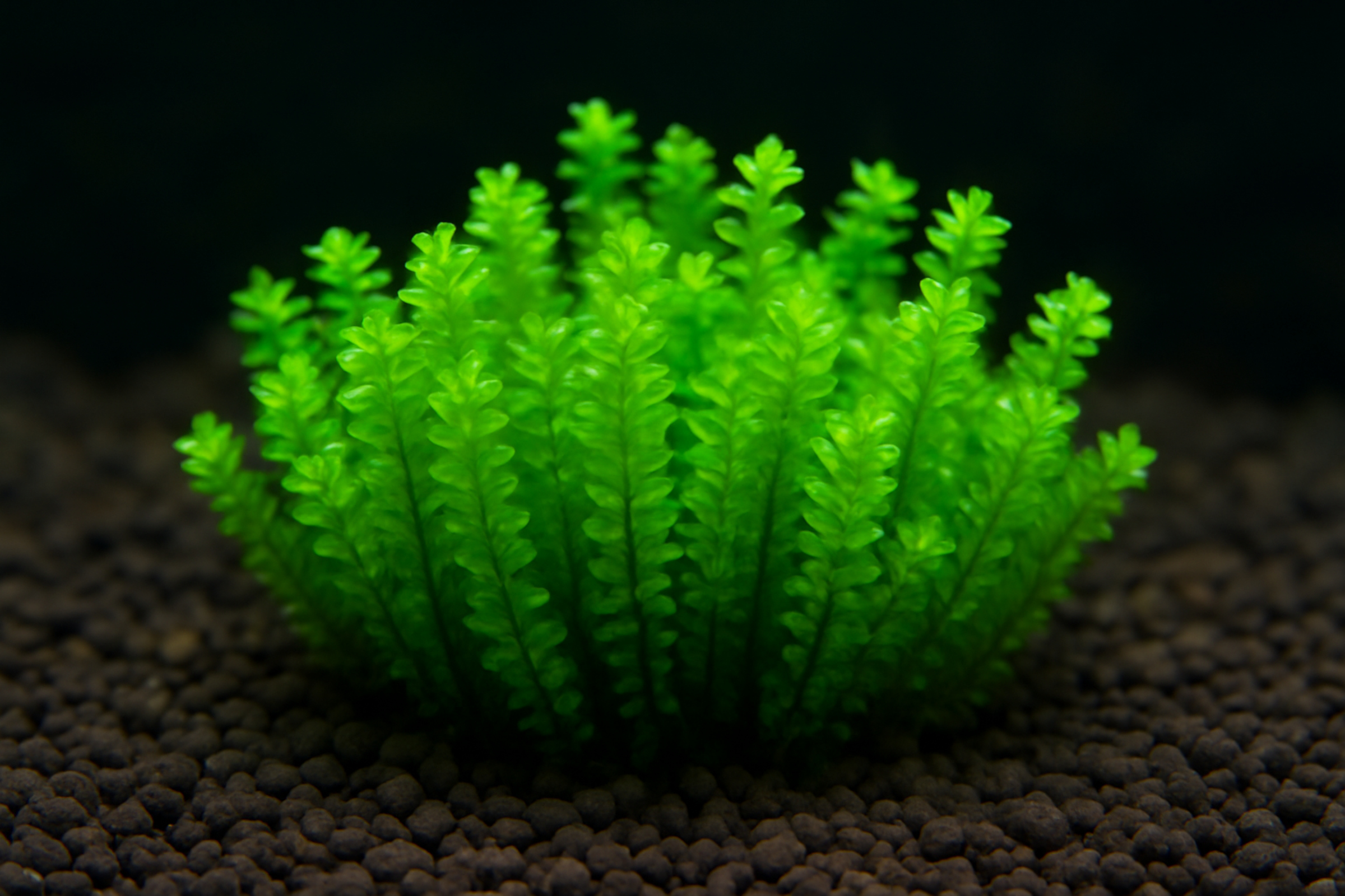 Der Nährstoffbedarf ist moderat. Eine sparsame, regelmäßige Mikronährstoffdüngung (Eisen/Spurenelemente) genügt meist, bei sehr magerem Wasser können geringe Makronährstoffgaben sinnvoll sein. Ziel ist eine stabile, ausgewogene Versorgung ohne Spitzen – zu viel Dünger fördert Algen in den feinen Polstern. Sichtbar helle Triebspitzen oder nachlassender Zuwachs sind ein Hinweis, die Dosierung leicht anzupassen.