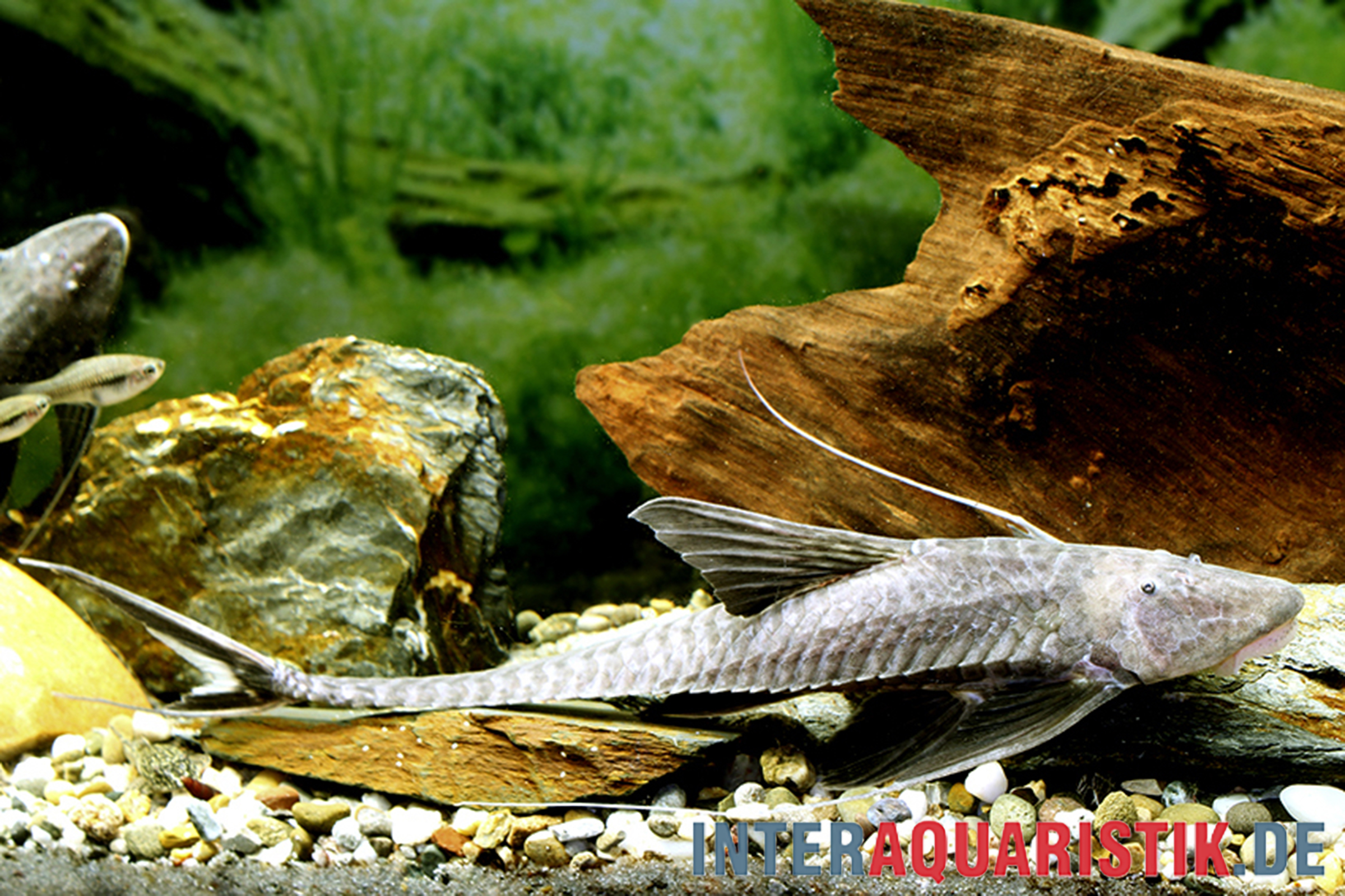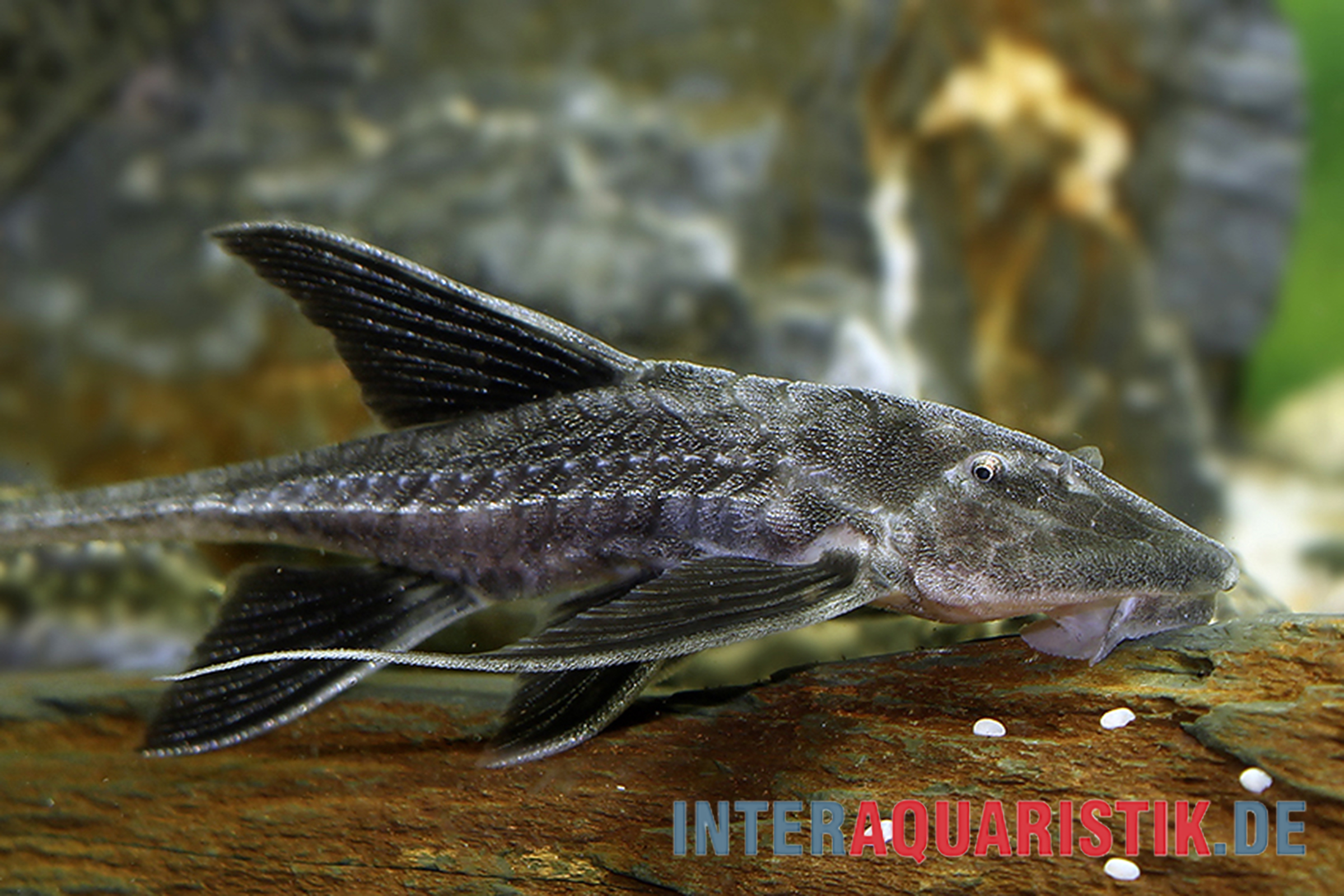 Die Bepflanzung sollte stabil und gut verwurzelt sein, da diese Art beim Abweiden von Aufwuchs auch Kontakt zu Pflanzen aufnimmt. Robuste Arten wie Echinodorus oder fest eingebundene Aufsitzerpflanzen eignen sich besonders gut. Offene Bodenflächen bleiben wichtig, damit der Wels seine typischen Ruhe- und Haftpositionen einnehmen kann.