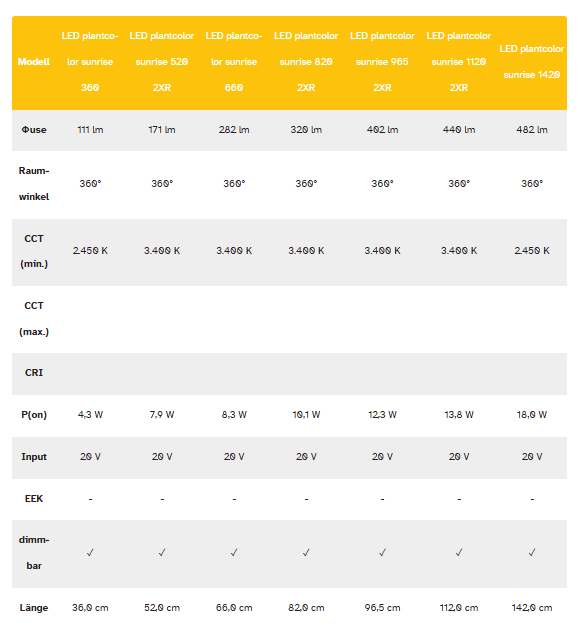 1× sera LED plantcolor sunrise in gewählter Länge (360–1120 mm). Vorschaltgerät, Dimmer und Halterungen sind nicht enthalten.