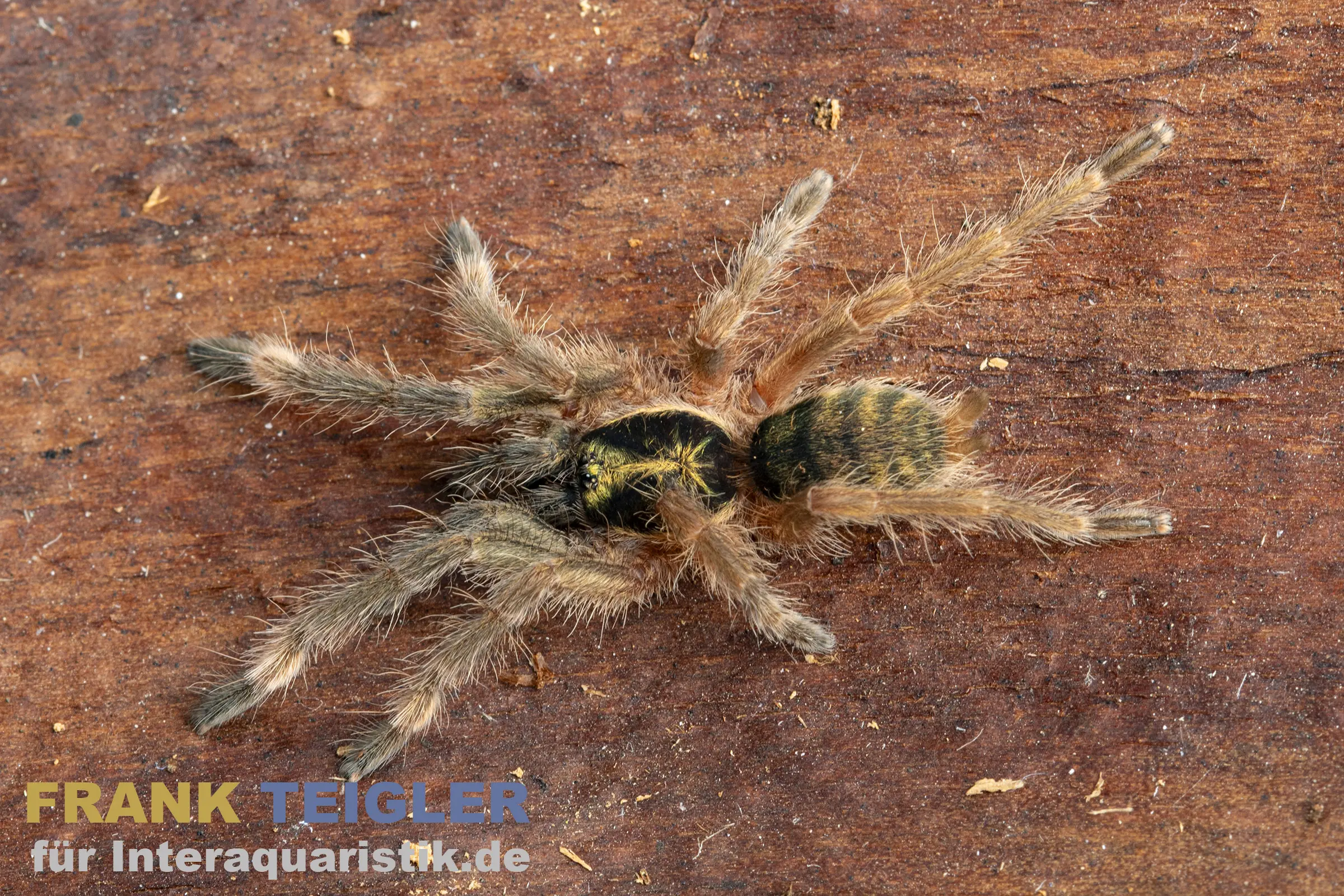Die Tiger-Zwergvogelspinne (Neoholothele incei) ist eine besonders kleine und dennoch auffällige Vertreterin der Vogelspinnen. Sie stammt aus den feuchten Regenwaldregionen Venezuelas und Trinidads, wo sie bodennah in dichten Gespinsten lebt. Die Art zeigt sich je nach Zuchtlinie in zwei Farbformen: der klassischen Tigerform mit dunklen Streifen auf gelblichem Grund und der sogenannten Goldform, die einfarbig goldbraun erscheint. Trotz ihrer geringen Größe ist sie äußerst lebhaft, baut komplexe Gespinste und kann sich gut an das Leben in menschlicher Obhut anpassen. Durch ihre hohe Aktivität und die Tendenz, sich auch tagsüber zu zeigen, zählt sie zu den beliebtesten Arten für kleinere Terrarien.
