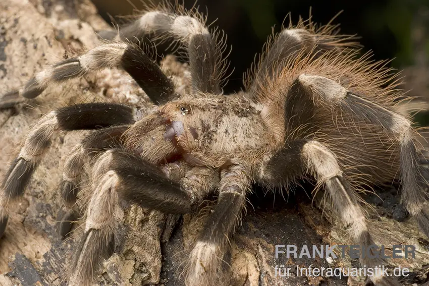 Die Weibchen der Weißknievogelspinne erreichen eine Beinspannweite von bis zu 18 cm. Die Männchen bleiben etwas kleiner.